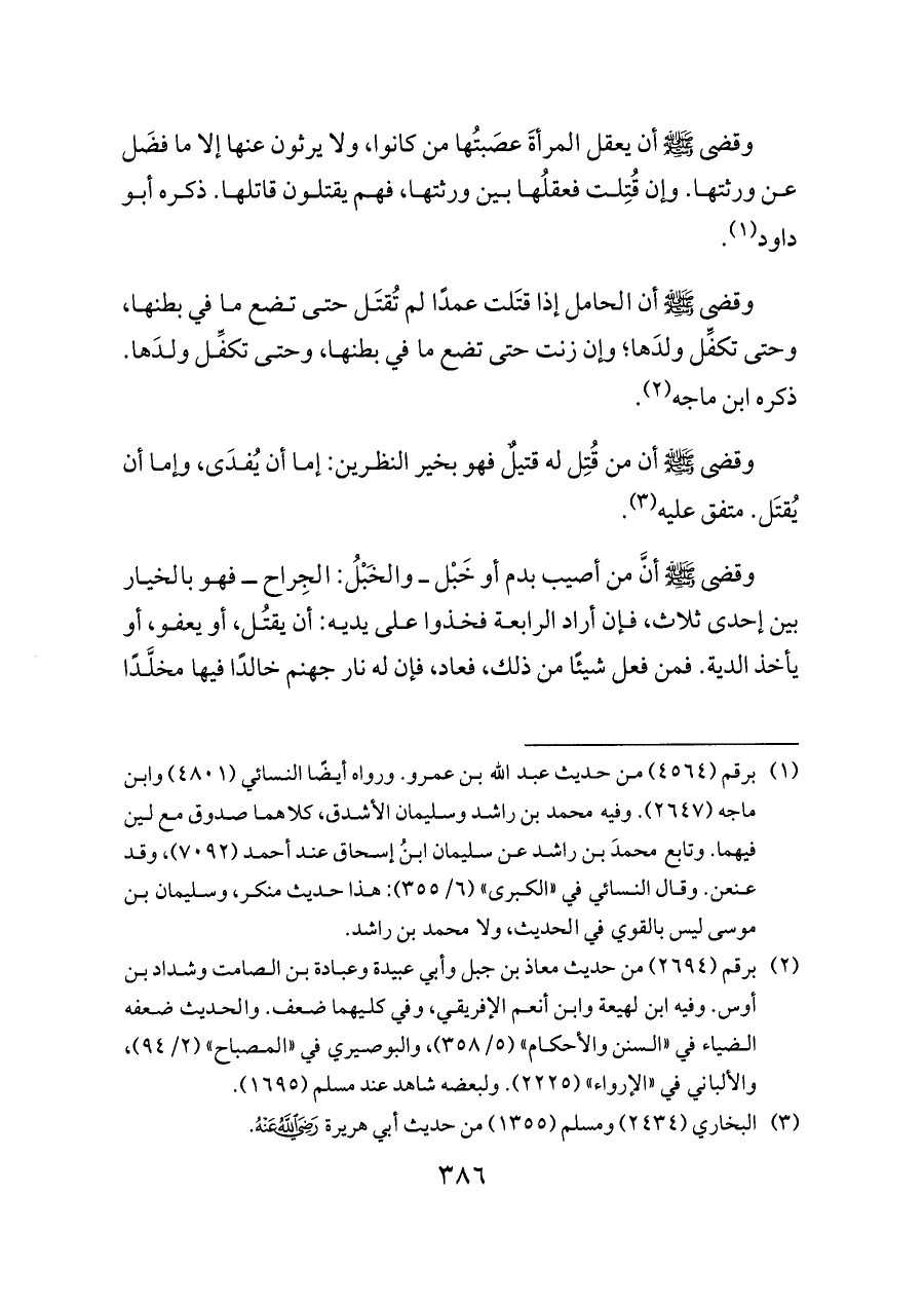 وقضى - صلى الله عليه وسلم - أنَّ من أصيب بدم أو خَبْل ــ والخَبْلُ: الجِراح ــ فهو بالخيار بين إحدى ثلاث، فإن أراد الرابعة فخذوا على يديه: أن يقتُل، أو يعفو، أو يأخذ الدية. فمن فعل شيئًا من ذلك، فعاد، فإن له نار جهنم خالدًا فيها مخلَّدًا