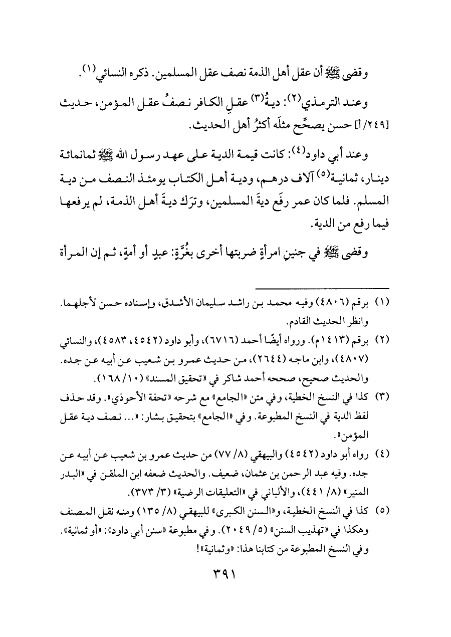 (¬٣) كذا في النسخ الخطية، وفي متن «الجامع» مع شرحه «تحفة الأحوذي». وقد حذف لفظ الدية في النسخ المطبوعة. وفي «الجامع» بتحقيق بشار: « ... نصف دية عقل المؤمن».