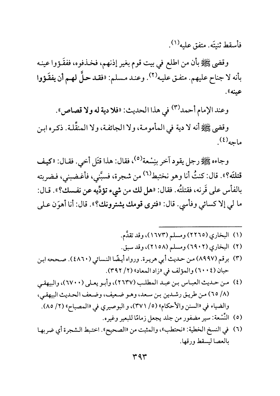 وقضى - صلى الله عليه وسلم - بأن من اطلع في بيت قوم بغير إذنهم، فخذفوه، ففقَؤوا عينه بأنه لا جناح عليهم. متفق عليه (¬٢). وعند مسلم: «فقد حلَّ لهم أن يفقَؤوا عينه».
