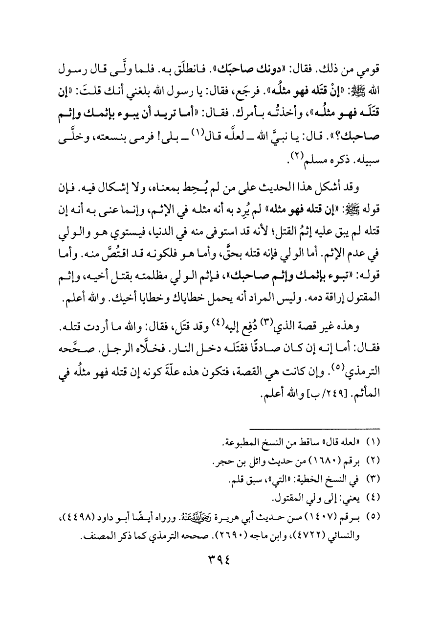 وهذه غير قصة الذي (¬٣) دُفِع إليه (¬٤) وقد قتَل، فقال: والله ما أردت قتله. فقال: أما إنه إن كان صادقًا فقتَله دخل النار. فخلَّاه الرجل. صحَّحه الترمذي (¬٥). وإن كانت هي القصة، فتكون هذه علّةَ كونه إن قتله فهو مثلُه في المأثم. [٢٤٩/ب] والله أعلم.