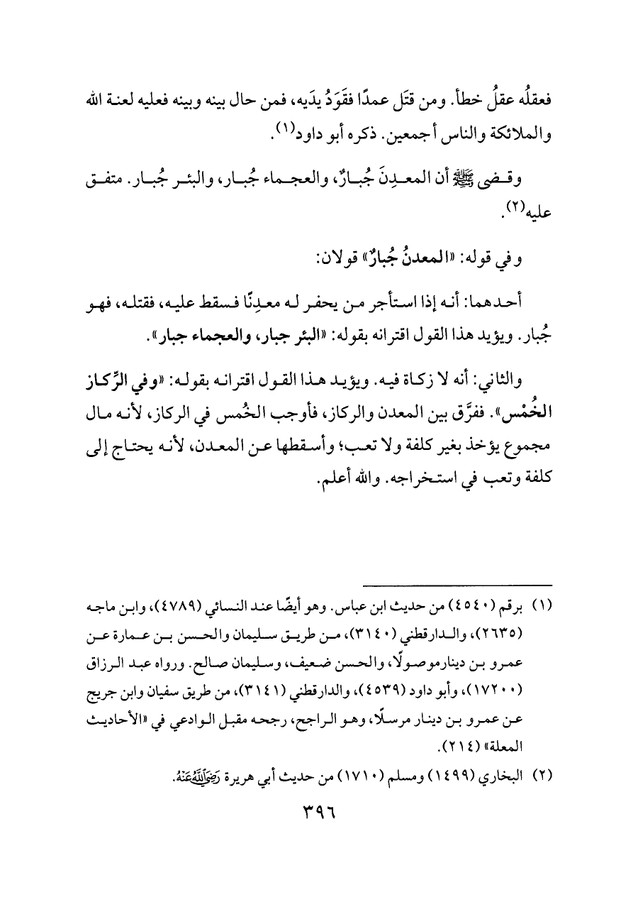 والثاني: أنه لا زكاة فيه. ويؤيد هذا القول اقترانه بقوله: «وفي الرِّكاز الخُمْس». ففرَّق بين المعدن والركاز، فأوجب الخُمس في الركاز، لأنه مال مجموع يؤخذ بغير كلفة ولا تعب؛ وأسقطها عن المعدن، لأنه يحتاج إلى كلفة وتعب في استخراجه. والله أعلم.