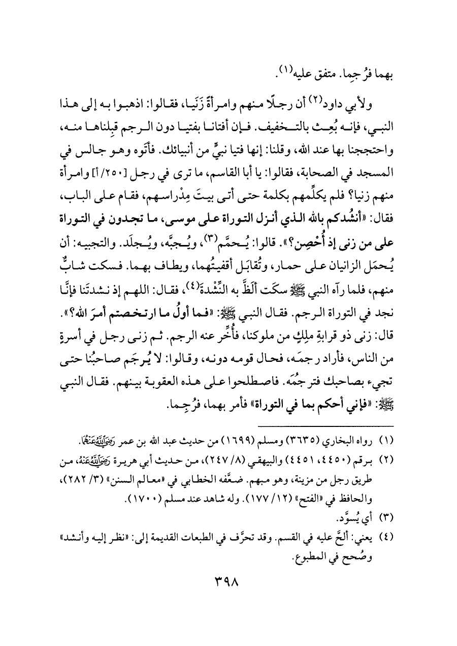 ولأبي داود (¬٢) أن رجلًا منهم وامرأةً زَنَيا، فقالوا: اذهبوا به إلى هذا النبي، فإنه بُعِث بالتخفيف. فإن أفتانا بفتيا دون الرجم قبِلناها منه، واحتججنا بها عند الله، وقلنا: إنها فتيا نبيٍّ من أنبيائك. فأتَوه وهو جالس في المسجد في الصحابة، فقالوا: يا أبا القاسم، ما ترى في رجل [٢٥٠/أ] وامرأة منهم زنيا؟ فلم يكلِّمهم بكلمة حتى أتى بيتَ مِدْراسهم، فقام على الباب، فقال: «أنشُدكم بالله الذي أنزل التوراة على موسى، ما تجدون في التوراة على من زنى إذ أُحْصِن؟». قالوا: يُحمَّم (¬٣)، ويُجبَّه، ويُجلَد. والتجبيه: أن يُحمَل الزانيان على حمار، وتُقابَل أقفيتُهما، ويطاف بهما. فسكت شابٌّ منهم، فلما رآه النبي - صلى الله عليه وسلم - سكَت ألَظَّ به النِّشْدةَ (¬٤)، فقال: اللهم إذ نشدتَنا فإنَّا نجد في التوراة الرجم. فقال النبي - صلى الله عليه وسلم -: «فما أولُ ما ارتخصتم أمرَ الله؟». قال: زنى ذو قرابةِ ملِكٍ من ملوكنا، فأُخِّر عنه الرجم. ثم زنى رجل في أسرةٍ من الناس، فأراد رجمَه، فحال قومه دونه، وقالوا: لا يُرجَم صاحبُنا حتى تجيء بصاحبك فترجُمَه. فاصطلحوا على هذه العقوبة بينهم. فقال النبي - صلى الله عليه وسلم -: «فإني أحكم بما في التوراة» فأمر بهما، فرُجِما.