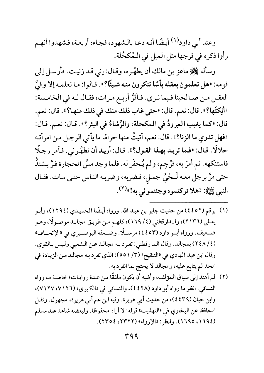 (¬٢) لم أهتد إلى سياق المؤلف، وأشبه أن يكون ملفقًا من عدة روايات؛ خاصة ما رواه النسائي. انظر ما رواه أبو داود (٤٤٢٨)، والنسائي في «الكبرى» (٧١٢٦، ٧١٢٧)، وابن حبان (٤٤٣٩)، من حديث أبي هريرة. وفيه ابن عم أبي هريرة، مجهول. ونقل الحافظ عن البخاري في «التهذيب» قوله: لا أراه محفوظا. ولبعضه شاهد عند مسلم (١٦٩٤، ١٦٩٥). وانظر: «الإرواء» (٢٣٢٢، ٢٣٥٤).