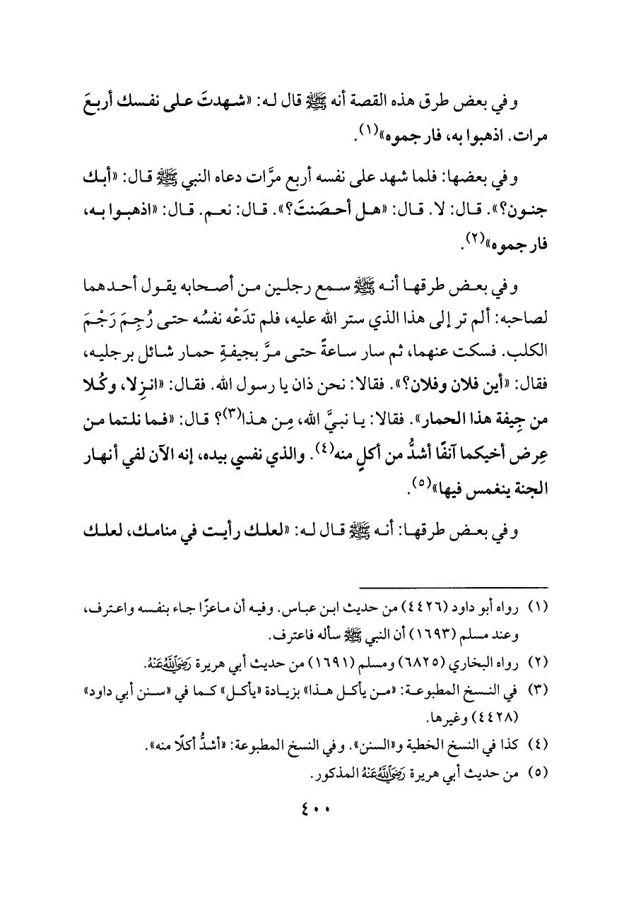 وفي بعض طرق هذه القصة أنه - صلى الله عليه وسلم - قال له: «شهدتَ على نفسك أربعَ مرات. اذهبوا به، فارجموه» (¬١).