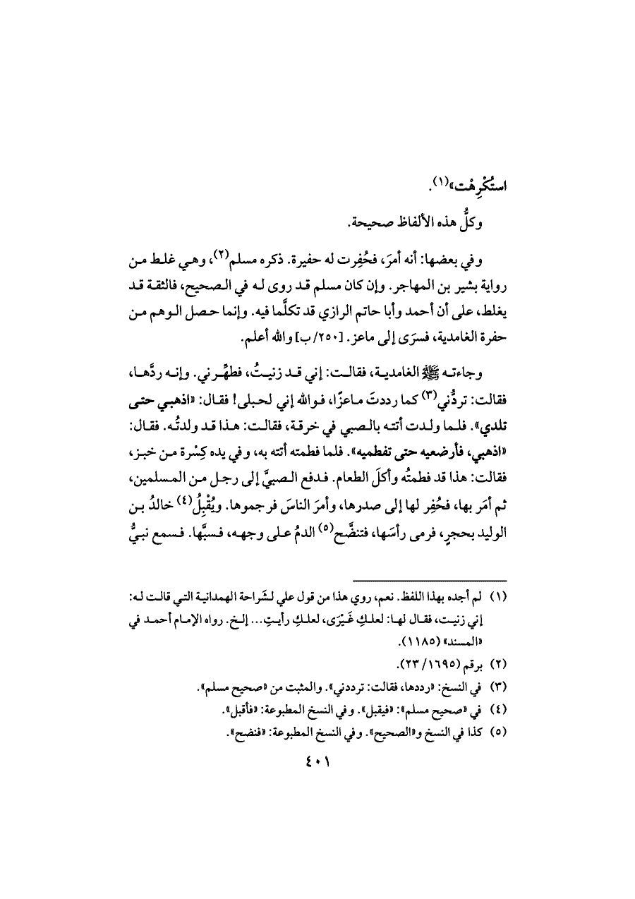 وفي بعضها: أنه أمرَ، فحُفِرت له حفيرة. ذكره مسلم (¬٢)، وهي غلط من رواية بشير بن المهاجر. وإن كان مسلم قد روى له في الصحيح، فالثقة قد يغلط، على أن أحمد وأبا حاتم الرازي قد تكلَّما فيه. وإنما حصل الوهم من حفرة الغامدية، فسرَى إلى ماعز. [٢٥٠/ب] والله أعلم.