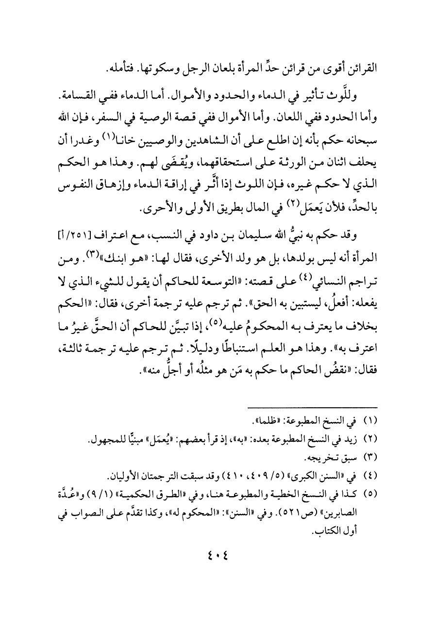 وقد حكم به نبيُّ الله سليمان بن داود في النسب، مع اعتراف [٢٥١/أ] المرأة أنه ليس بولدها، بل هو ولد الأخرى، فقال لها: «هو ابنك» (¬٣). ومن تراجم النسائي (¬٤) على قصته: «التوسعة للحاكم أن يقول للشيء الذي لا يفعله: أفعلُ، ليستبين به الحق». ثم ترجم عليه ترجمة أخرى، فقال: «الحكم بخلاف ما يعترف به المحكومُ عليه (¬٥)، إذا تبيَّن للحاكم أن الحقَّ غيرُ ما اعترف به». وهذا هو العلم استنباطًا ودليلًا. ثم ترجم عليه ترجمة ثالثة، فقال: «نقضُ الحاكم ما حكم به مَن هو مثلُه أو أجلُّ منه».