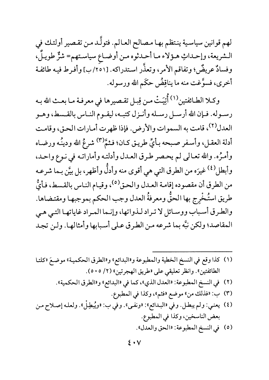 لهم قوانين سياسية ينتظم بها مصالح العالم. فتولَّد من تقصير أولئك في الشريعة، وإحداثِ هؤلاء ما أحدثوه من أوضاعِ سياستهم= شرٌّ طويلٌ، وفسادٌ عريضٌ؛ وتفاقم الأمر، وتعذَّر استدراكه. [٢٥١/ب] وأفرط فيه طائفة أخرى، فسوَّغت منه ما يناقِضُ حكَم الله ورسوله.