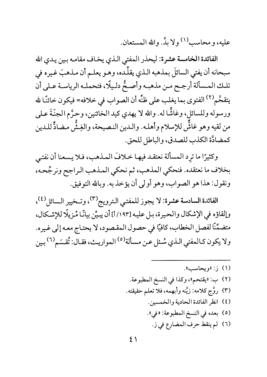 الفائدة السادسة عشرة: لا يجوز للمفتي الترويج (¬٣)، وتخيير السائل (¬٤)، وإلقاؤه في الإشكال والحيرة، بل عليه [١٩٣/أ] أن يبيِّن بيانًا مُزيلًا للإشكال، متضمِّنًا لفصل الخطاب، كافيًا في حصول المقصود، لا يحتاج معه إلى غيره. ولا يكون كالمفتي الذي سُئل عن مسألة (¬٥) المواريث، فقال: تُقسَم (¬٦) بين