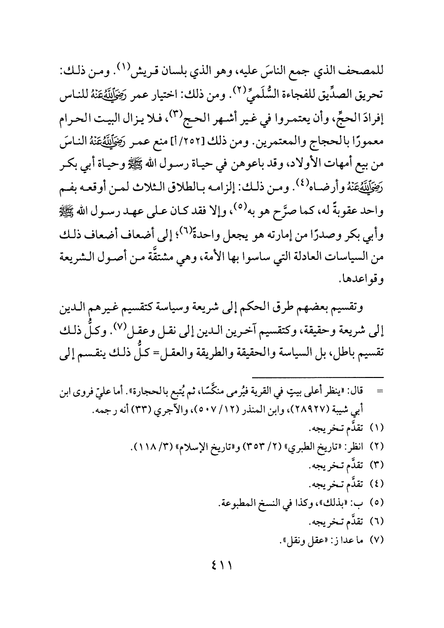ومن ذلك [٢٥٢/أ] منع عمر - رضي الله عنه - الناسَ من بيع أمهات الأولاد، وقد باعوهن في حياة رسول الله - صلى الله عليه وسلم - وحياة أبي بكر - رضي الله عنه - وأرضاه (¬٤). ومن ذلك: إلزامه بالطلاق الثلاث لمن أوقعه بفم واحد عقوبةً له، كما صرَّح هو به (¬٥)، وإلا فقد كان على عهد رسول الله - صلى الله عليه وسلم - وأبي بكر وصدرًا من إمارته هو يجعل واحدةً (¬٦)؛ إلى أضعاف أضعاف ذلك من السياسات العادلة التي ساسوا بها الأمة، وهي مشتقَّة من أصول الشريعة وقواعدها.