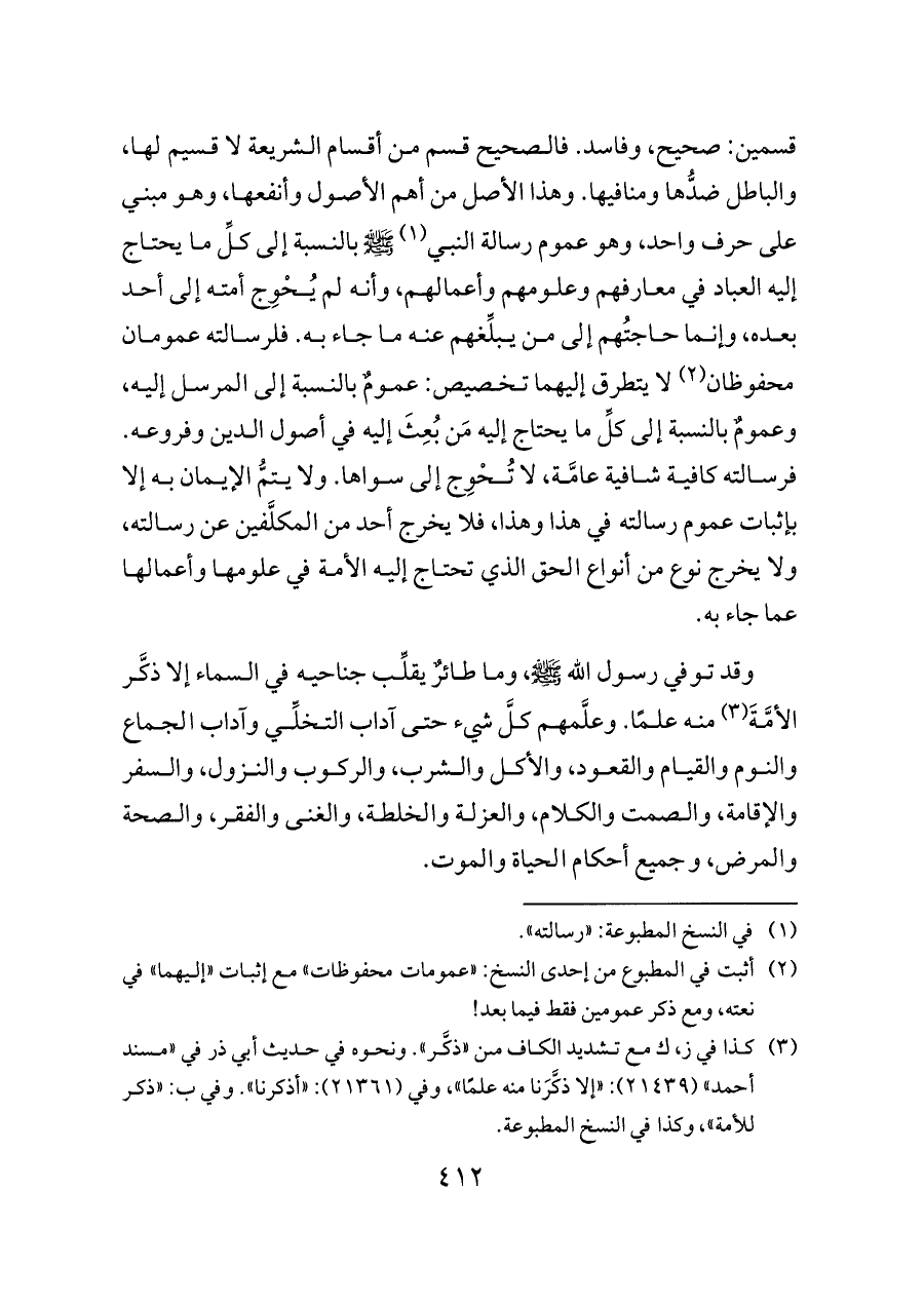 قسمين: صحيح، وفاسد. فالصحيح قسم من أقسام الشريعة لا قسيم لها، والباطل ضدُّها ومنافيها. وهذا الأصل من أهم الأصول وأنفعها، وهو مبني على حرف واحد، وهو عموم رسالة النبي (¬١) - صلى الله عليه وسلم - بالنسبة إلى كلِّ ما يحتاج إليه العباد في معارفهم وعلومهم وأعمالهم، وأنه لم يُحْوِج أمته إلى أحد بعده، وإنما حاجتُهم إلى من يبلِّغهم عنه ما جاء به. فلرسالته عمومان محفوظان (¬٢) لا يتطرق إليهما تخصيص: عمومٌ بالنسبة إلى المرسل إليه، وعمومٌ بالنسبة إلى كلِّ ما يحتاج إليه مَن بُعِثَ إليه في أصول الدين وفروعه. فرسالته كافية شافية عامَّة، لا تُحْوِج إلى سواها. ولا يتمُّ الإيمان به إلا بإثبات عموم رسالته في هذا وهذا، فلا يخرج أحد من المكلَّفين عن رسالته، ولا يخرج نوع من أنواع الحق الذي تحتاج إليه الأمة في علومها وأعمالها عما جاء به.