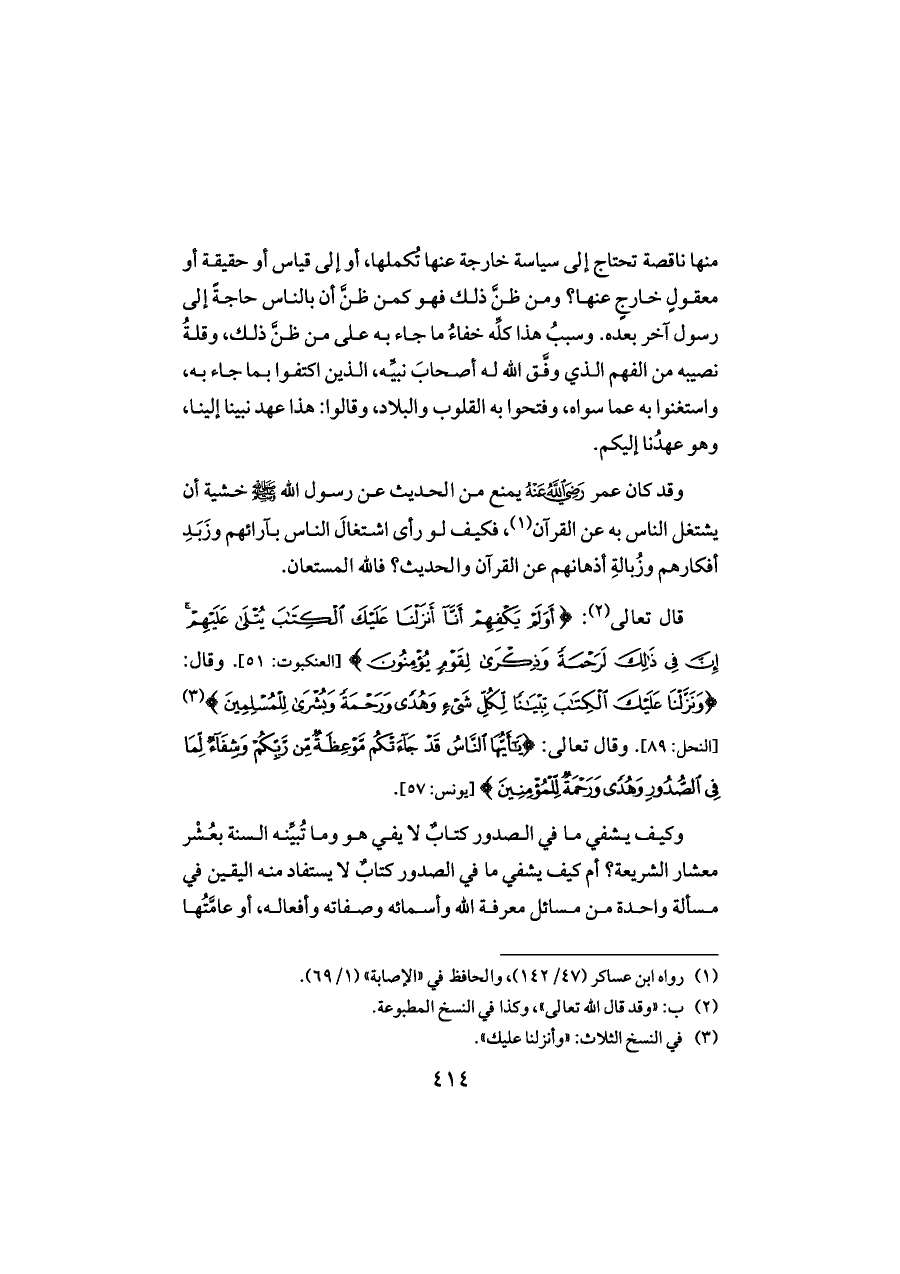 وكيف يشفي ما في الصدور كتابٌ لا يفي هو وما تُبيِّنه السنة بعُشْر معشار الشريعة؟ أم كيف يشفي ما في الصدور كتابٌ لا يستفاد منه اليقين في مسألة واحدة من مسائل معرفة الله وأسمائه وصفاته وأفعاله، أو عامَّتُها
