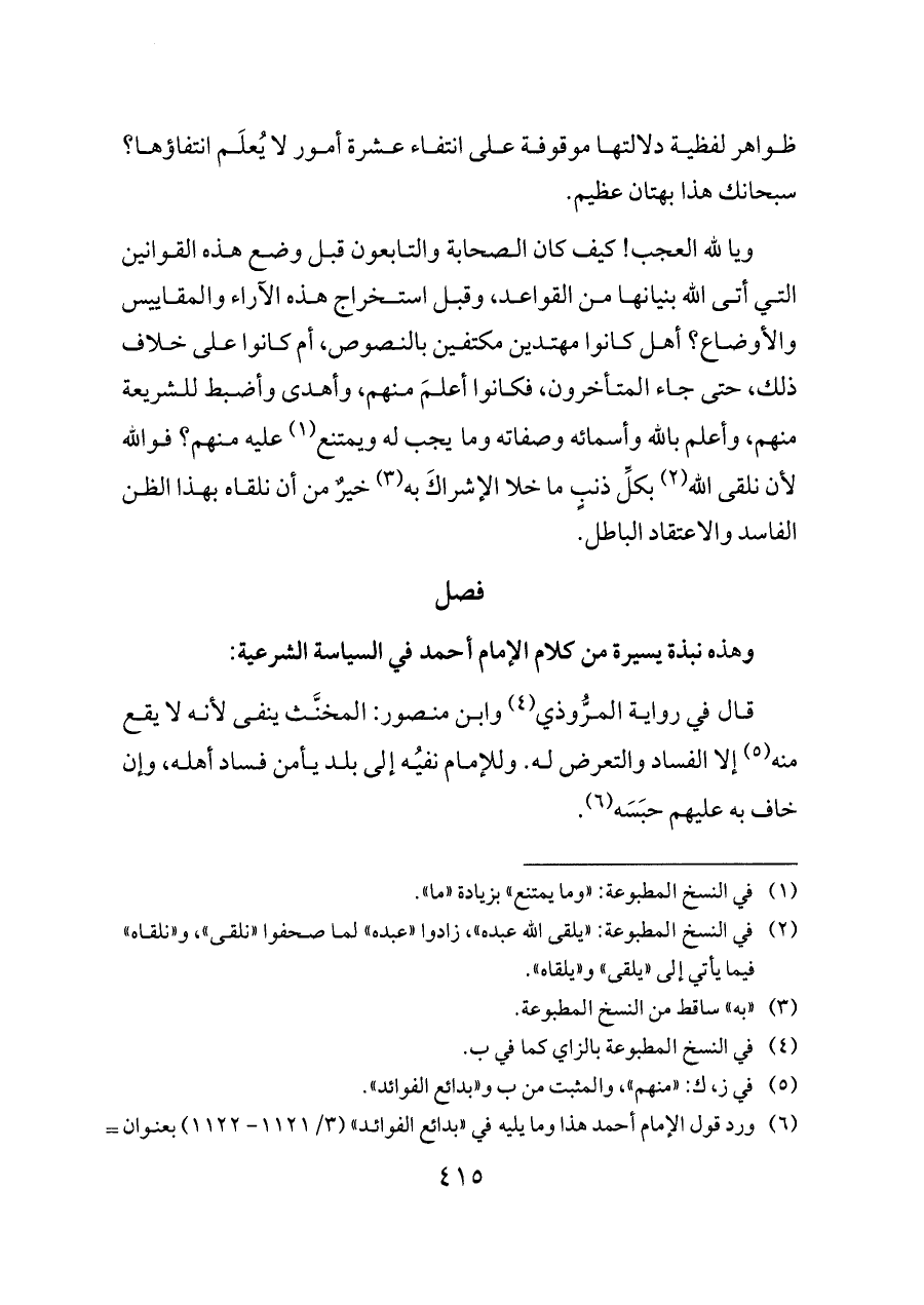 ويا لله العجب! كيف كان الصحابة والتابعون قبل وضع هذه القوانين التي أتى الله بنيانها من القواعد، وقبل استخراج هذه الآراء والمقاييس والأوضاع؟ أهل كانوا مهتدين مكتفين بالنصوص، أم كانوا على خلاف ذلك، حتى جاء المتأخرون، فكانوا أعلمَ منهم، وأهدى وأضبط للشريعة منهم، وأعلم بالله وأسمائه وصفاته وما يجب له ويمتنع (¬١) عليه منهم؟ فوالله لأن نلقى الله (¬٢) بكلِّ ذنبٍ ما خلا الإشراكَ به (¬٣) خيرٌ من أن نلقاه بهذا الظن الفاسد والاعتقاد الباطل.