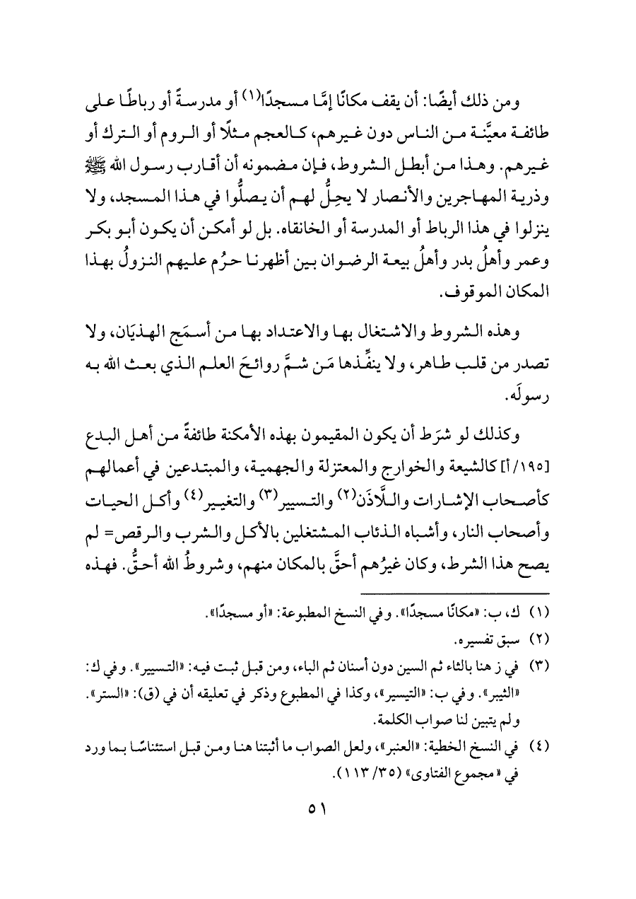 وكذلك لو شرَط أن يكون المقيمون بهذه الأمكنة طائفةً من أهل البدع [١٩٥/أ] كالشيعة والخوارج والمعتزلة والجهمية، والمبتدعين في أعمالهم كأصحاب الإشارات واللَّاذَن (¬٢) والتسيير (¬٣) والتغيير (¬٤) وأكل الحيات وأصحاب النار، وأشباه الذئاب المشتغلين بالأكل والشرب والرقص= لم يصح هذا الشرط، وكان غيرُهم أحقَّ بالمكان منهم، وشروطُ الله أحقُّ. فهذه