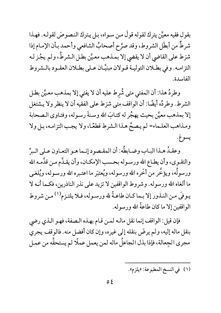 وعقدُ هذا الباب وضابطُه: أن المقصود إنما هو التعاون على البرِّ والتقوى، وأن يطاع الله ورسوله بحسب الإمكان، وأن يقدَّم من قدَّمه الله ورسولُه، ويؤخَّر من أخّره الله ورسوله، ويُعتبَر ما اعتبره الله ورسوله، ويُلغى ما ألغاه الله ورسوله. وشروط الواقفين لا تزيد على نذر الناذرين، فكما أنه لا يوفَى من النذور إلا بما كان طاعةً لله ورسوله، فلا يلتزم (¬١) من شروط الواقفين إلا ما كان طاعةً الله ورسوله.