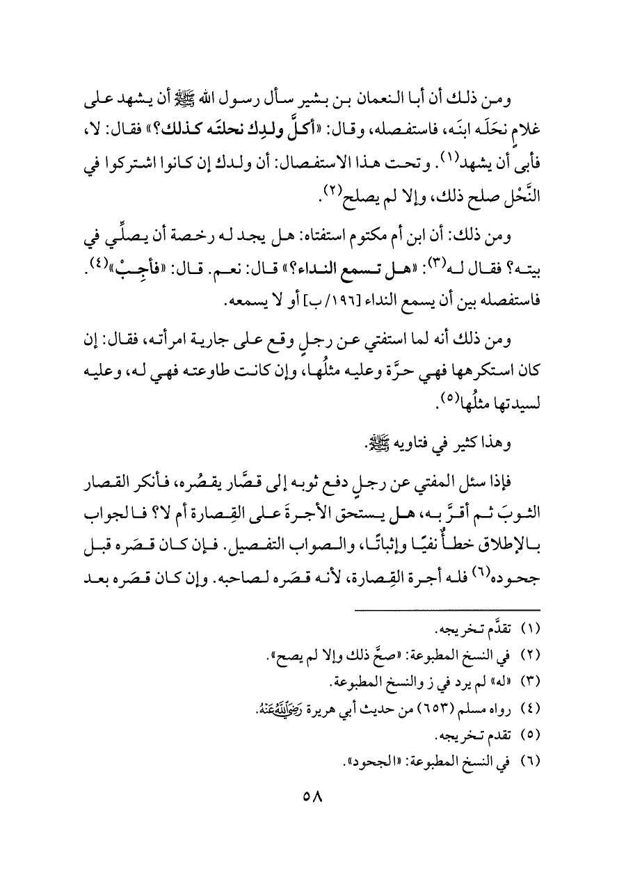 ومن ذلك: أن ابن أم مكتوم استفتاه: هل يجد له رخصة أن يصلِّي في بيته؟ فقال له (¬٣): «هل تسمع النداء؟» قال: نعم. قال: «فأجِبْ» (¬٤). فاستفصله بين أن يسمع النداء [١٩٦/ب] أو لا يسمعه.