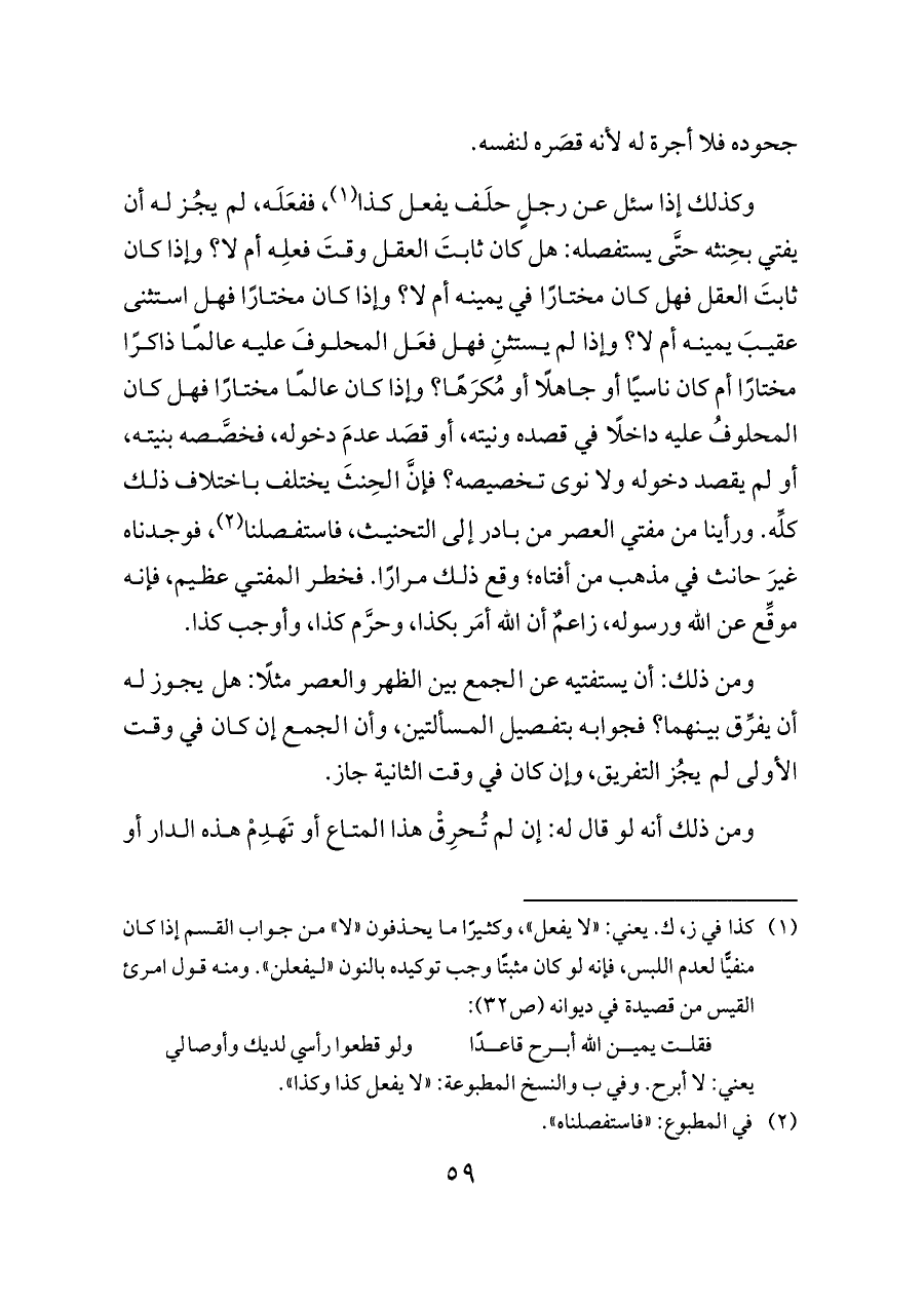 وكذلك إذا سئل عن رجلٍ حلَف يفعل كذا (¬١)، ففعَلَه، لم يجُز له أن يفتي بحِنثه حتَّى يستفصله: هل كان ثابتَ العقل وقتَ فعلِه أم لا؟ وإذا كان ثابتَ العقل فهل كان مختارًا في يمينه أم لا؟ وإذا كان مختارًا فهل استثنى عقيبَ يمينه أم لا؟ وإذا لم يستثنِ فهل فعَل المحلوفَ عليه عالمًا ذاكرًا مختارًا أم كان ناسيًا أو جاهلًا أو مُكرَهًا؟ وإذا كان عالمًا مختارًا فهل كان المحلوفُ عليه داخلًا في قصده ونيته، أو قصَد عدمَ دخوله، فخصَّصه بنيته، أو لم يقصد دخوله ولا نوى تخصيصه؟ فإنَّ الحِنثَ يختلف باختلاف ذلك كلِّه. ورأينا من مفتي العصر من بادر إلى التحنيث، فاستفصلنا (¬٢)، فوجدناه غيرَ حانث في مذهب من أفتاه؛ وقع ذلك مرارًا. فخطر المفتي عظيم، فإنه موقِّع عن الله ورسوله، زاعمٌ أن الله أمَر بكذا، وحرَّم كذا، وأوجب كذا.
