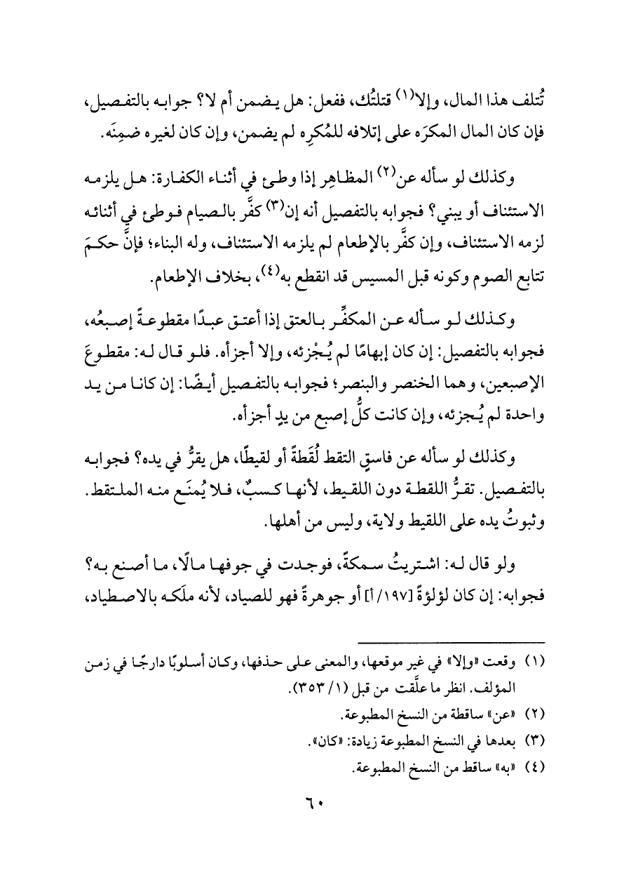 وكذلك لو سأله عن المكفِّر بالعتق إذا أعتق عبدًا مقطوعةً إصبعُه، فجوابه بالتفصيل: إن كان إبهامًا لم يُجْزئه، وإلا أجزأه. فلو قال له: مقطوعَ الإصبعين، وهما الخنصر والبنصر؛ فجوابه بالتفصيل أيضًا: إن كانا من يد واحدة لم يُجزئه، وإن كانت كلُّ إصبع من يدٍ أجزأه.