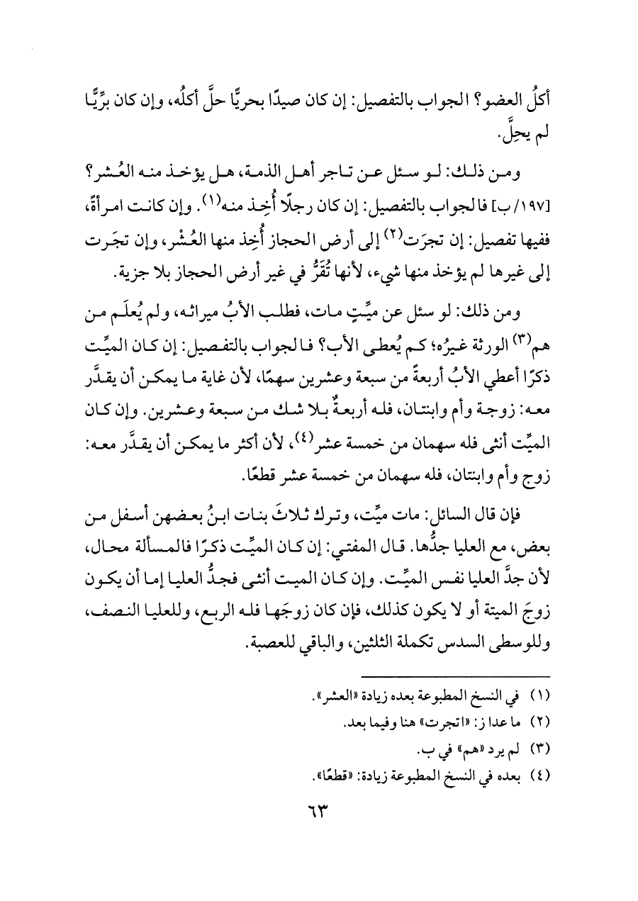 ومن ذلك: لو سئل عن ميِّتٍ مات، فطلب الأبُ ميراثه، ولم يُعلَم من هم (¬٣) الورثة غيرُه؛ كم يُعطى الأب؟ فالجواب بالتفصيل: إن كان الميِّت ذكرًا أعطي الأبُ أربعةً من سبعة وعشرين سهمًا، لأن غاية ما يمكن أن يقدَّر معه: زوجة وأم وابنتان، فله أربعةٌ بلا شك من سبعة وعشرين. وإن كان الميِّت أنثى فله سهمان من خمسة عشر (¬٤)، لأن أكثر ما يمكن أن يقدَّر معه: زوج وأم وابنتان، فله سهمان من خمسة عشر قطعًا.