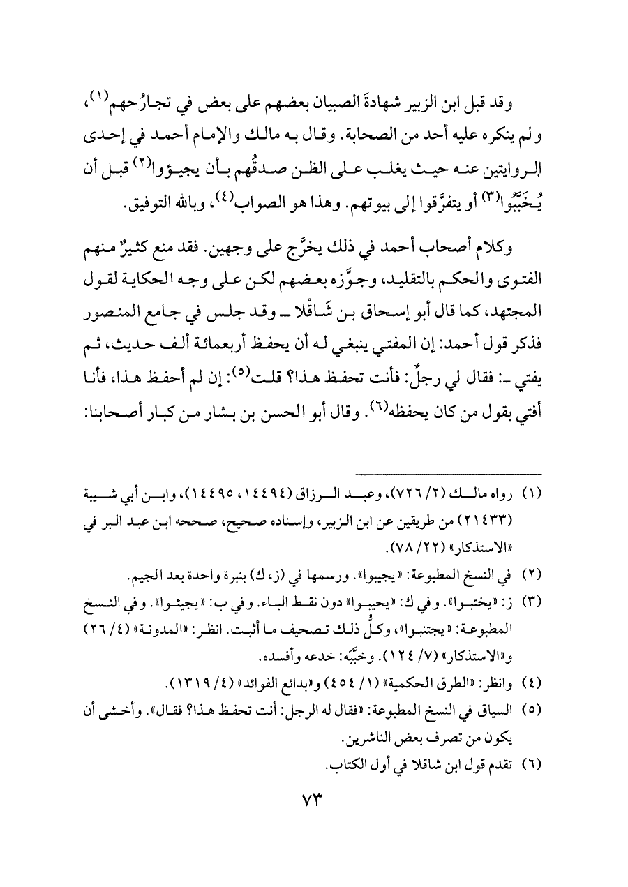 وقد قبل ابن الزبير شهادةَ الصبيان بعضهم على بعض في تجارُحهم (¬١)، ولم ينكره عليه أحد من الصحابة. وقال به مالك والإمام أحمد في إحدى الروايتين عنه حيث يغلب على الظن صدقُهم بأن يجيؤوا (¬٢) قبل أن يُخَبَّبُوا (¬٣) أو يتفرَّقوا إلى بيوتهم. وهذا هو الصواب (¬٤)، وبالله التوفيق.