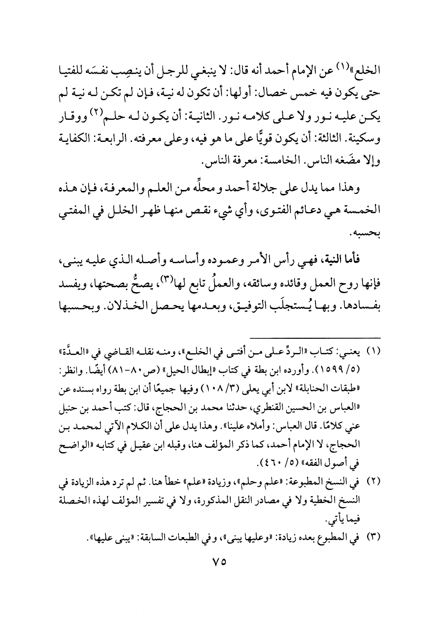 الخلع» (¬١) عن الإمام أحمد أنه قال: لا ينبغي للرجل أن ينصِب نفسَه للفتيا حتى يكون فيه خمس خصال: أولها: أن تكون له نية، فإن لم تكن له نية لم يكن عليه نور ولا على كلامه نور. الثانية: أن يكون له حلم (¬٢) ووقار وسكينة. الثالثة: أن يكون قويًّا على ما هو فيه، وعلى معرفته. الرابعة: الكفاية وإلا مضَغه الناس. الخامسة: معرفة الناس.