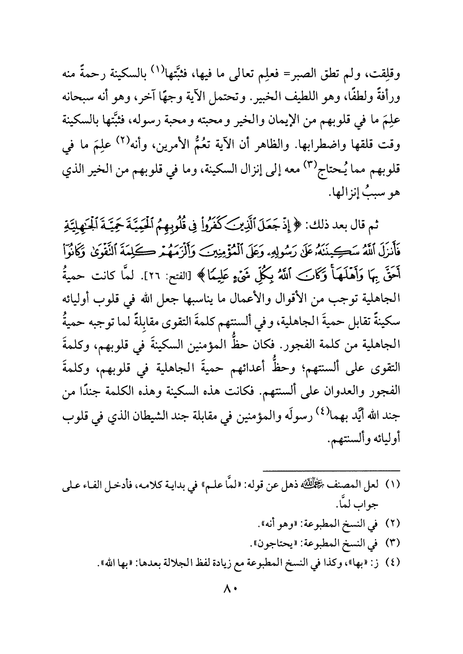 ثم قال بعد ذلك: {إِذْ جَعَلَ الَّذِينَ كَفَرُوا فِي قُلُوبِهِمُ الْحَمِيَّةَ حَمِيَّةَ الْجَاهِلِيَّةِ فَأَنْزَلَ اللَّهُ سَكِينَتَهُ عَلَى رَسُولِهِ وَعَلَى الْمُؤْمِنِينَ وَأَلْزَمَهُمْ كَلِمَةَ التَّقْوَى وَكَانُوا أَحَقَّ بِهَا وَأَهْلَهَا وَكَانَ اللَّهُ بِكُلِّ شَيْءٍ عَلِيمًا} [الفتح: ٢٦]. لمَّا كانت حميةُ الجاهلية توجب من الأقوال والأعمال ما يناسبها جعل الله في قلوب أوليائه سكينةً تقابل حميةَ الجاهلية، وفي ألسنتهم كلمةَ التقوى مقابِلةً لما توجبه حميةُ الجاهلية من كلمة الفجور. فكان حظُّ المؤمنين السكينةَ في قلوبهم، وكلمةَ التقوى على ألسنتهم؛ وحظُّ أعدائهم حميةَ الجاهلية في قلوبهم، وكلمةَ الفجور والعدوان على ألسنتهم. فكانت هذه السكينة وهذه الكلمة جندًا من جند الله أيَّد بهما (¬٤) رسولَه والمؤمنين في مقابلة جند الشيطان الذي في قلوب أوليائه وألسنتهم.