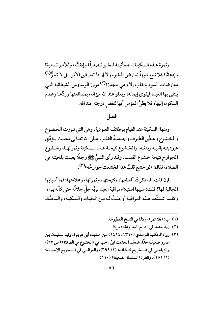 ومنها: السكينة عند القيام بوظائف العبودية، وهي التي تورث الخضوع والخشوع وغضَّ الطرف وجمعيةَ القلب على الله تعالى بحيث يؤدِّي عبوديته بقلبه وبدنه. والخشوع نتيجة هذه السكينة وثمرتها، وخشوع الجوارح نتيجة خشوع القلب. وقد رأى النبيُّ - صلى الله عليه وسلم - رجلًا يعبث بلحيته في الصلاة، فقال: «لو خشع قلبُ هذا لخشعت جوارحُه» (¬٣).