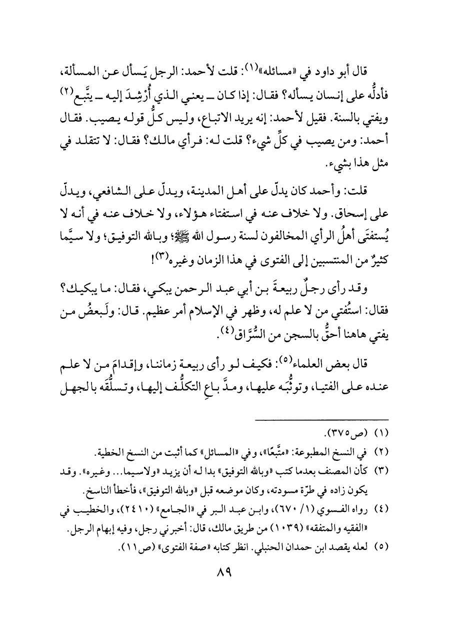 (¬٥) لعله يقصد ابن حمدان الحنبلي. انظر كتابه «صفة الفتوى» (ص ١١).