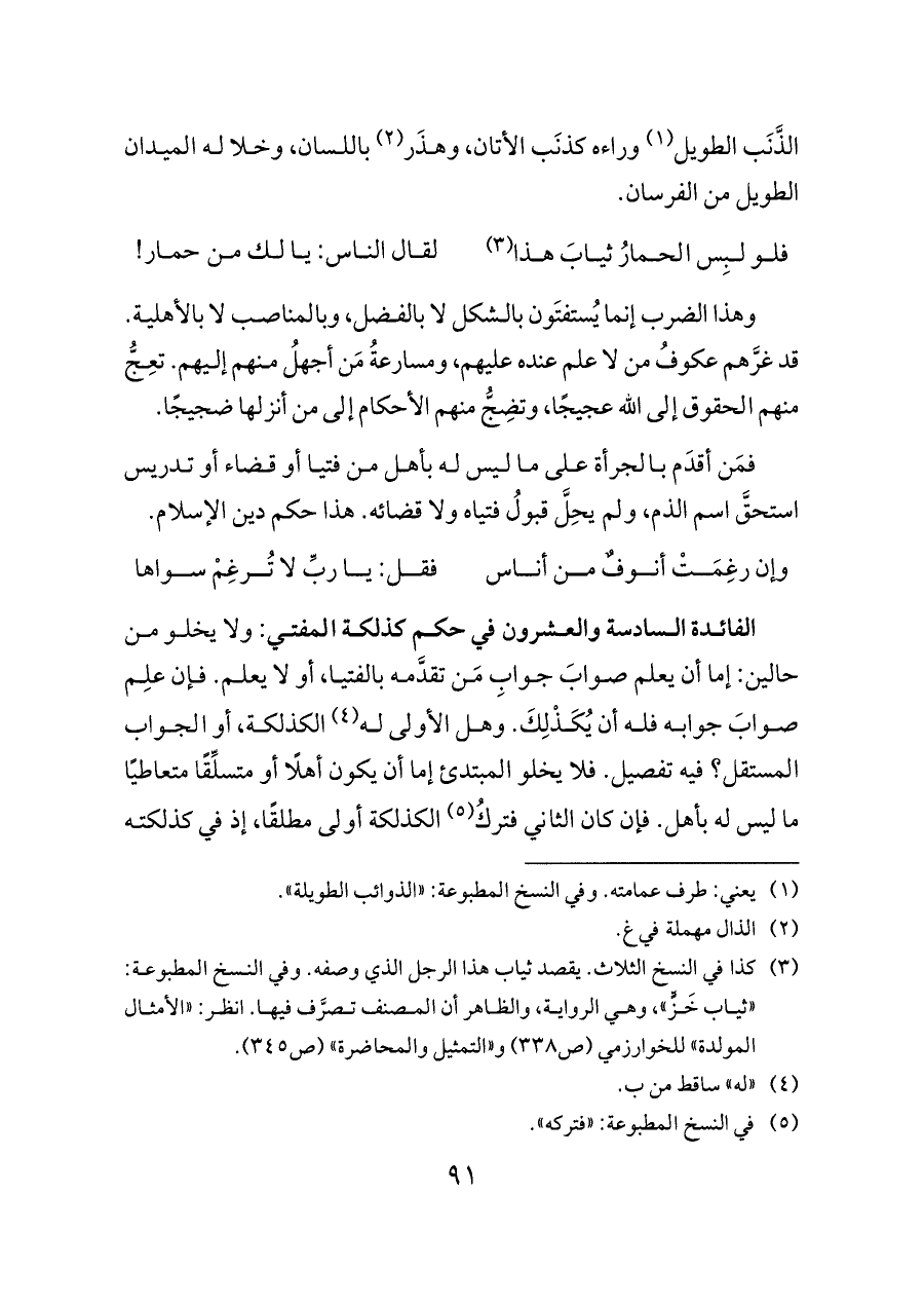 الفائدة السادسة والعشرون في حكم كذلكة المفتي: ولا يخلو من حالين: إما أن يعلم صوابَ جوابِ مَن تقدَّمه بالفتيا، أو لا يعلم. فإن علِم صوابَ جوابه فله أن يُكَذْلِكَ. وهل الأولى له (¬٤) الكذلكة، أو الجواب المستقل؟ فيه تفصيل. فلا يخلو المبتدئ إما أن يكون أهلًا أو متسلِّقًا متعاطيًا ما ليس له بأهل. فإن كان الثاني فتركُ (¬٥) الكذلكة أولى مطلقًا، إذ في كذلكته