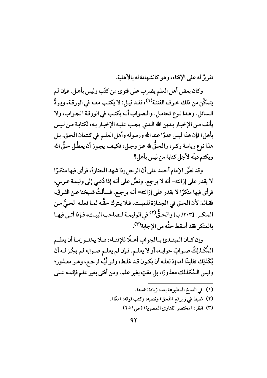 وكان بعض أهل العلم يضرب على فتوى من كتَب وليس بأهل. فإن لم يتمكَّن من ذلك خوف الفتنة (¬١)، فقد قيل: لا يكتب معه في الورقة، ويردُّ السائل. وهذا نوع تحامل. والصواب أنه يكتب في الورقة الجواب، ولا يأنف من الإخبار بدين الله الذي يجب عليه الإخبار به، لكتابة من ليس بأهل؛ فإن هذا ليس عذرًا عند الله ورسوله وأهل العلم في كتمان الحق. بل هذا نوع رياسة وكبر، والحقُّ لله عز وجل، فكيف يجوز أن يعطِّل حقَّ الله ويكتم دينَه لأجل كتابة من ليس بأهل؟