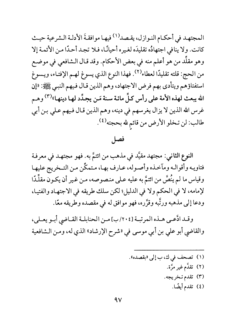 وقد ادَّعى هذه المرتبة [٢٠٤/ب] من الحنابلة القاضي أبو يعلى، والقاضي أبو علي بن أبي موسى في «شرح الإرشاد» الذي له، ومن الشافعية