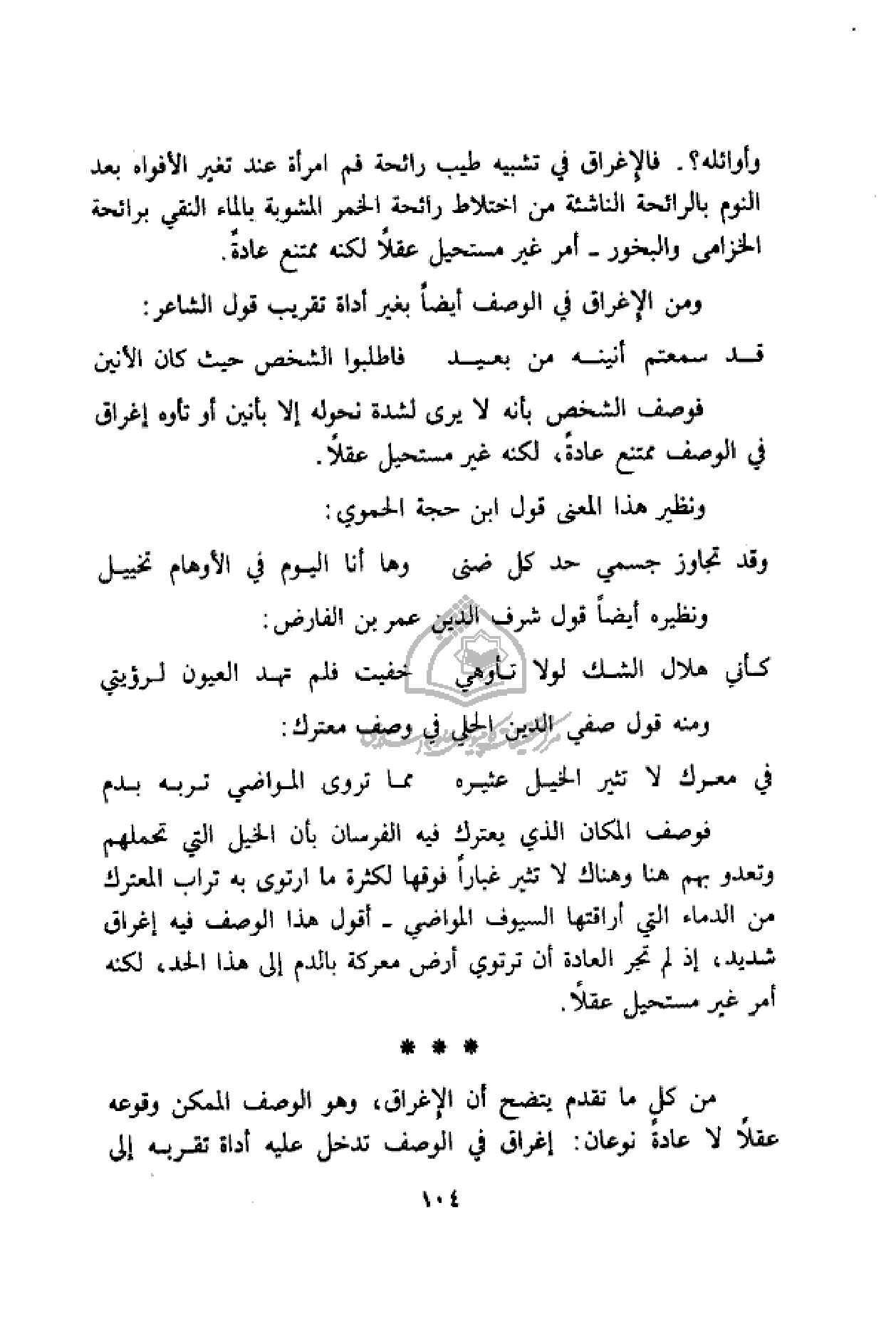 ما ارتوى به تراب المعترك من الدماء التي أراقتها السيوف المواضي- أقول هذا الوصف فيه إغراق شديد، إذ لم تجر العادة أن ترتوي أرض معركة بالدم إلى هذا الحد، لكنه أمر غير مستحيل عقلا.