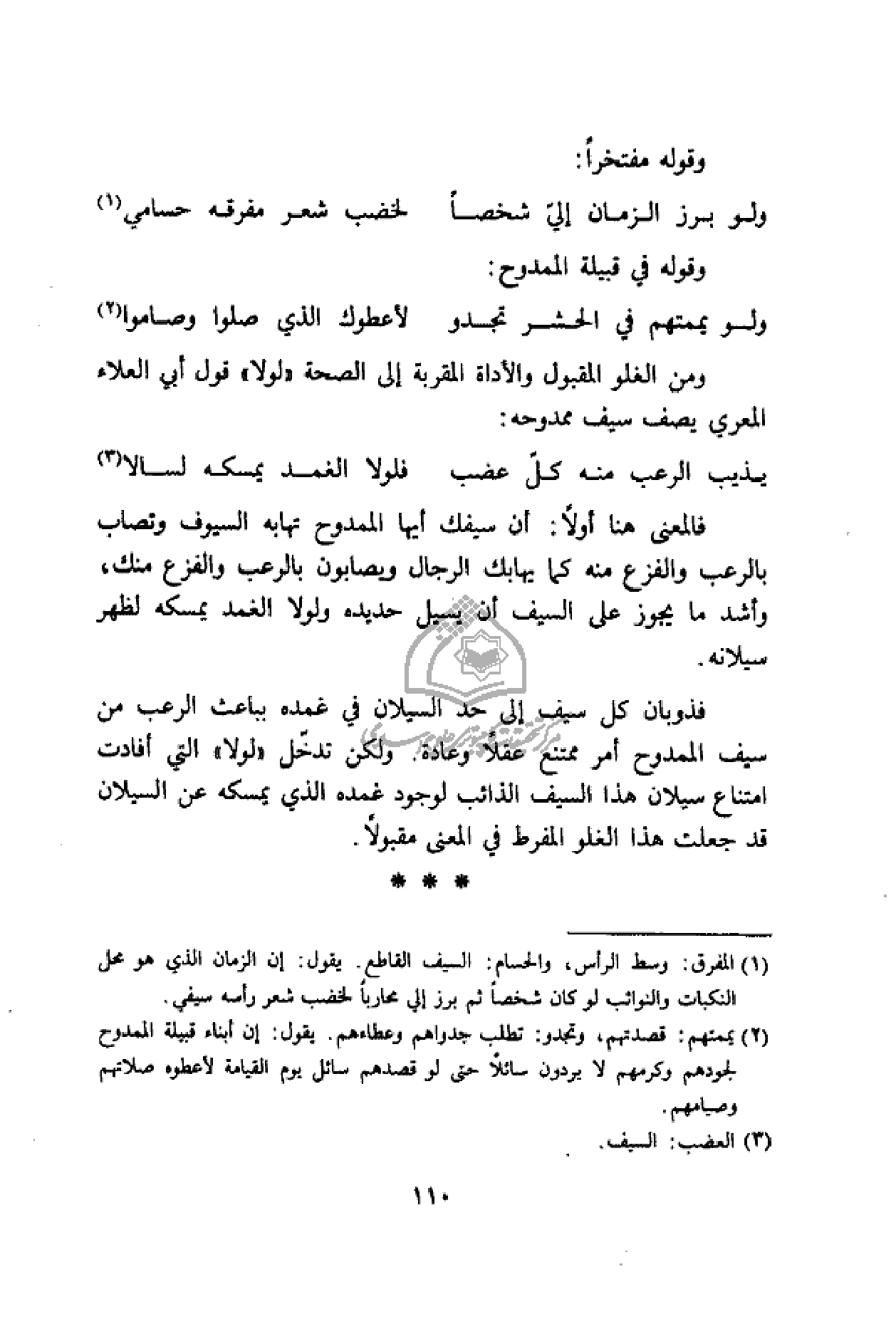 ومن الغلو المقبول والأداة المقربة إلى الصحة «لولا» قول أبي العلاء المعري يصف سيف ممدوحه: