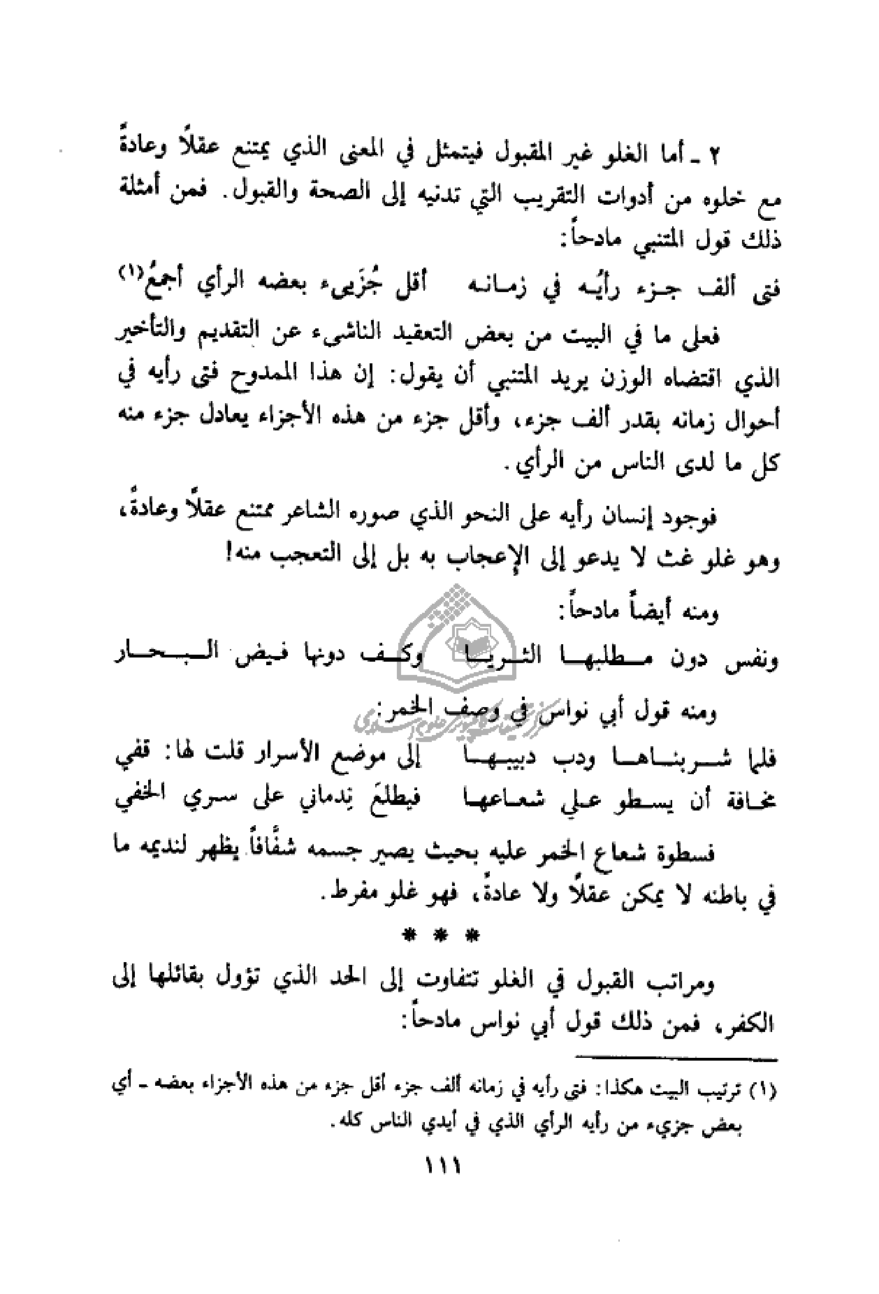 ومراتب القبول في الغلو تتفاوت إلى الحد الذي تؤول بقائلها إلى الكفر، فمن ذلك قول أبي نواس مادحا: