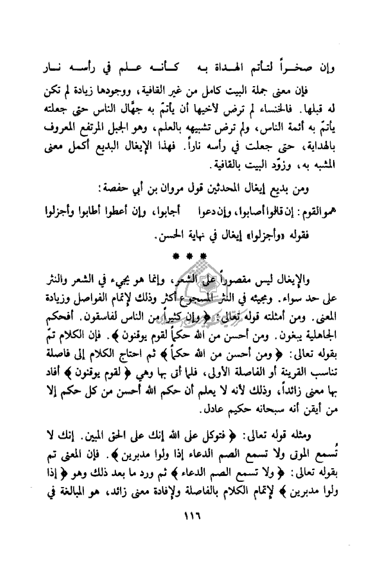 فإن معنى جملة البيت كامل من غير القافية، ووجودها زيادة لم تكن له قبلها. فالخنساء لم ترض لأخيها أن يأتمّ به جهّال الناس حتى جعلته يأتمّ به أئمة الناس، ولم ترض تشبيهه بالعلم، وهو الجبل المرتفع المعروف بالهداية، حتى جعلت في رأسه نارا. فهذا الإيغال البديع أكمل معنى المشبه به، وزوّد البيت بالقافية.