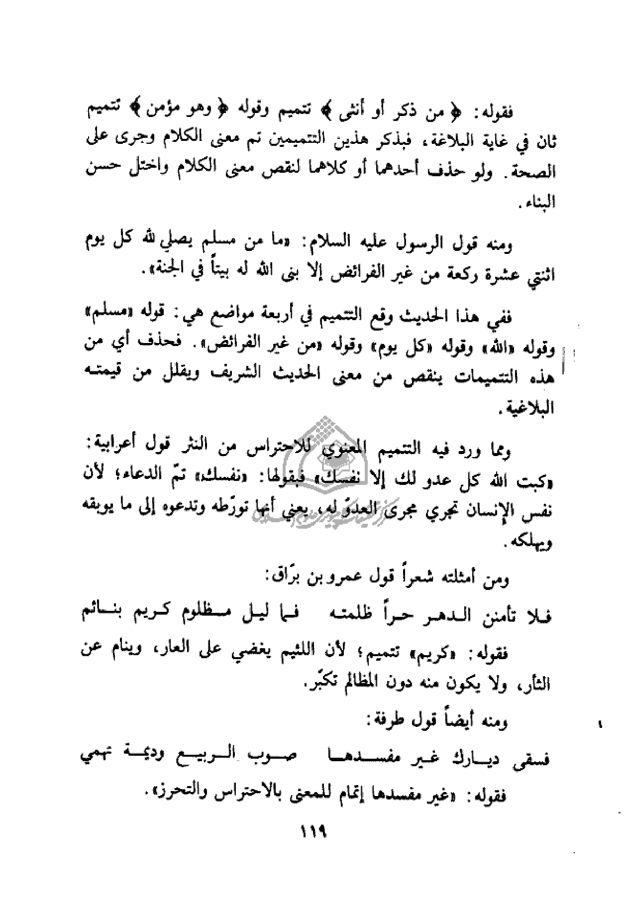 ففي هذا الحديث وقع التتميم في أربعة مواضع هي: قوله «مسلم» وقوله «الله» وقوله «كل يوم» وقوله «من غير الفرائض». فحذف أي من هذه التتميمات ينقص من معنى الحديث الشريف ويقلل من قيمته البلاغية.
