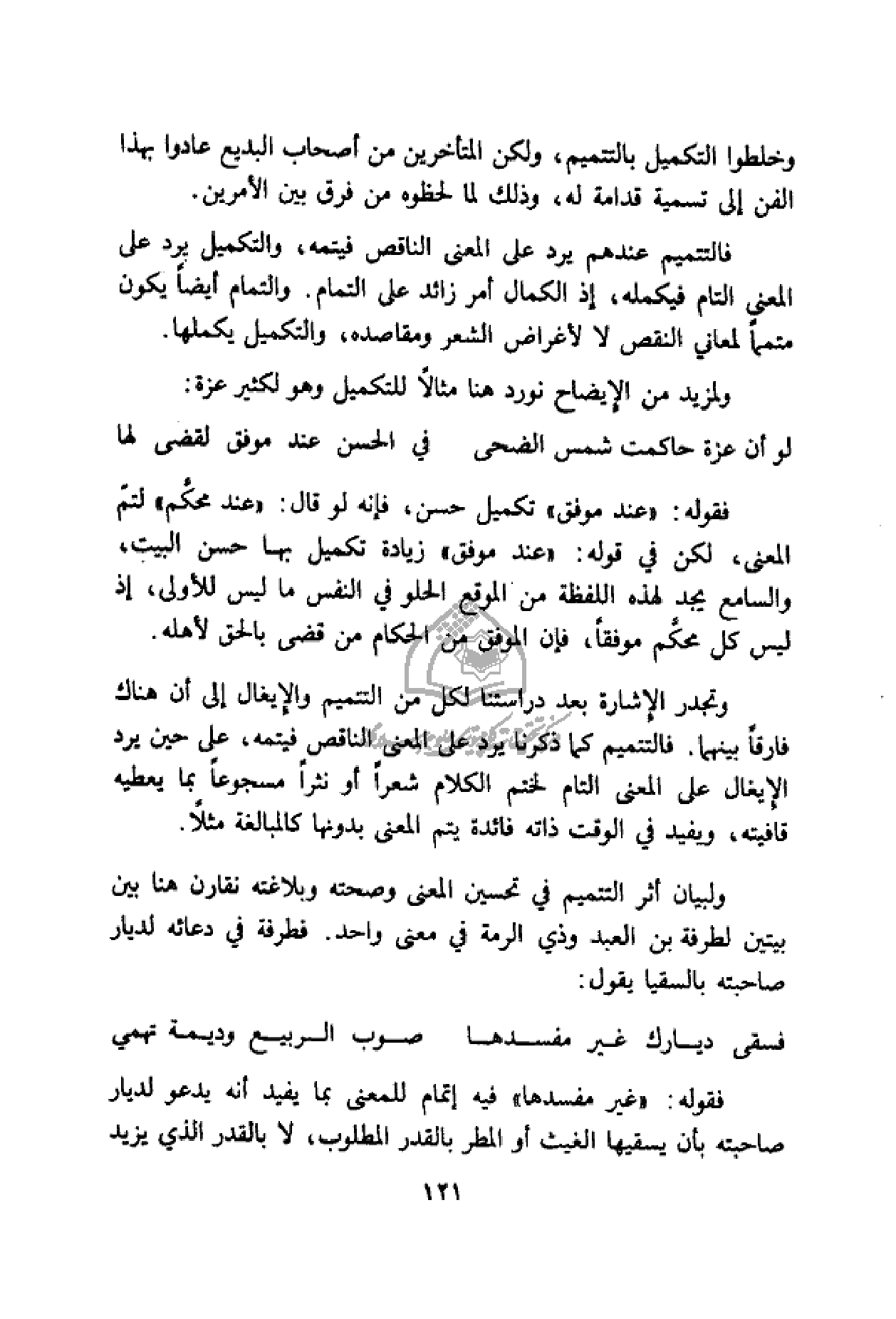 فالتتميم عندهم يرد على المعنى الناقص فيتمه، والتكميل يرد على المعنى التام فيكمله، إذ الكمال أمر زائد على التمام. والتمام أيضا يكون متمما لمعاني النقص لا لأغراض الشعر ومقاصده، والتكميل يكملها.