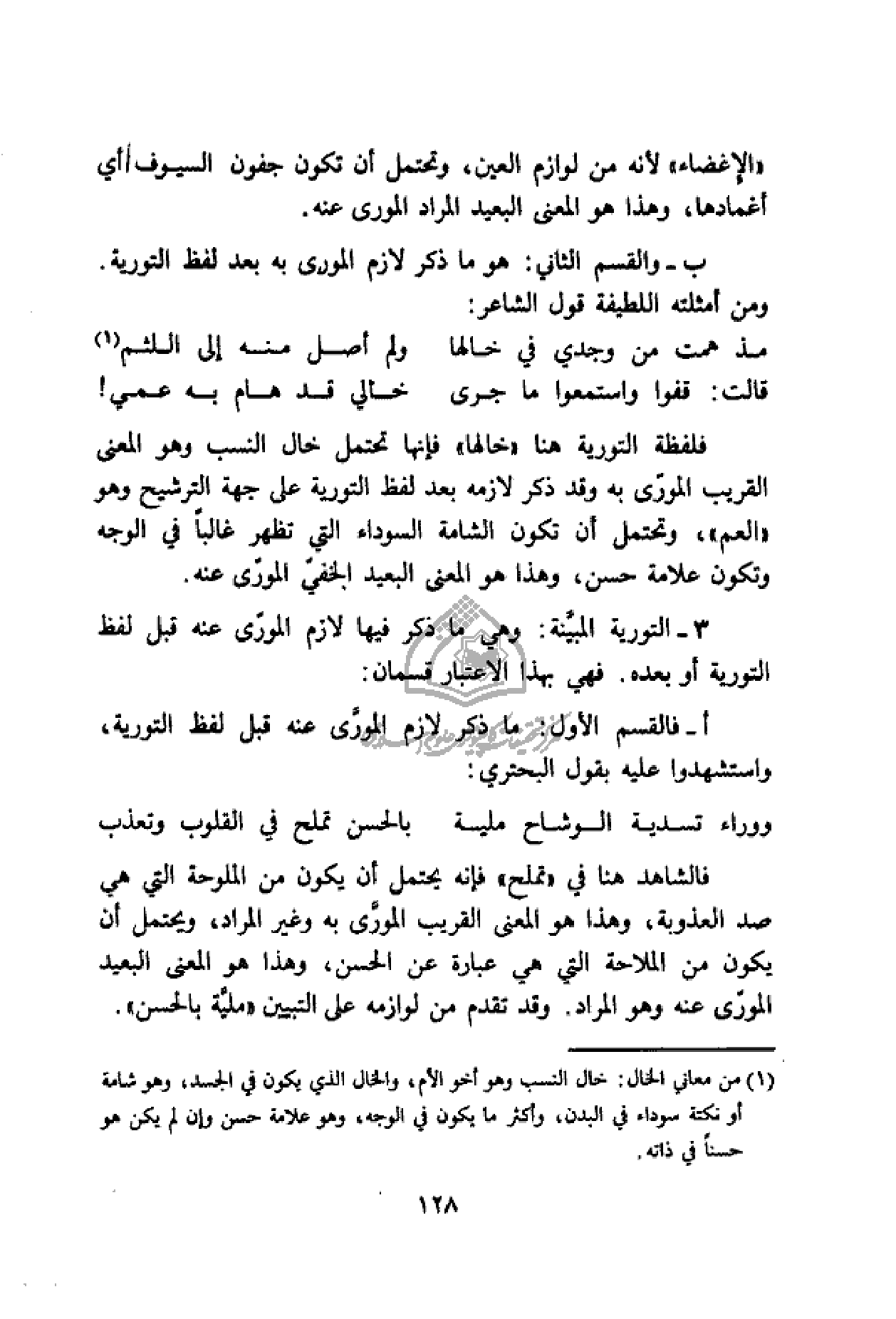فلفظة التورية هنا «خالها» فإنها تحتمل خال النسب وهو المعنى القريب المورّى به وقد ذكر لازمه بعد لفظ التورية على جهة الترشيح وهو «العم»، وتحتمل أن تكون الشامة السوداء التي تظهر غالبا في الوجه وتكون علامة حسن، وهذا هو المعنى البعيد الخفيّ المورّى عنه.