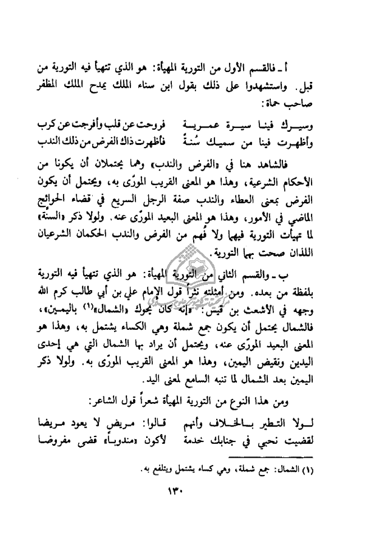 ب- والقسم الثاني من التورية المهيأة: هو الذي تتهيأ فيه التورية بلفظة من بعده. ومن أمثلته نثرا قول الإمام علي بن أبي طالب كرم الله وجهه في الأشعث بن قيس: «إنه كان يحوك «الشمال» (¬1) باليمين»، فالشمال يحتمل أن يكون جمع شملة وهي الكساء يشتمل به، وهذا هو المعنى البعيد المورّى عنه، ويحتمل أن يراد بها الشمال التي هي إحدى اليدين ونقيض اليمين، وهذا هو المعنى القريب المورّى به. ولولا ذكر اليمين بعد الشمال لما تنبه السامع لمعنى اليد.