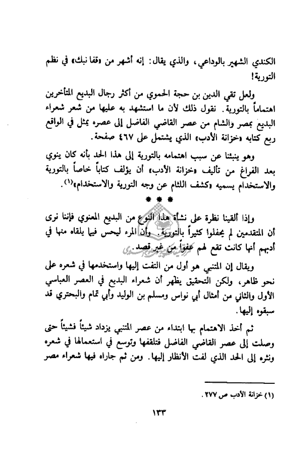 وهو ينبئنا عن سبب اهتمامه بالتورية إلى هذا الحد بأنه كان ينوي بعد الفراغ من تأليف «خزانة الأدب» أن يؤلف كتابا خاصا بالتورية والاستخدام يسميه «كشف اللثام عن وجه التورية والاستخدام» (¬1).