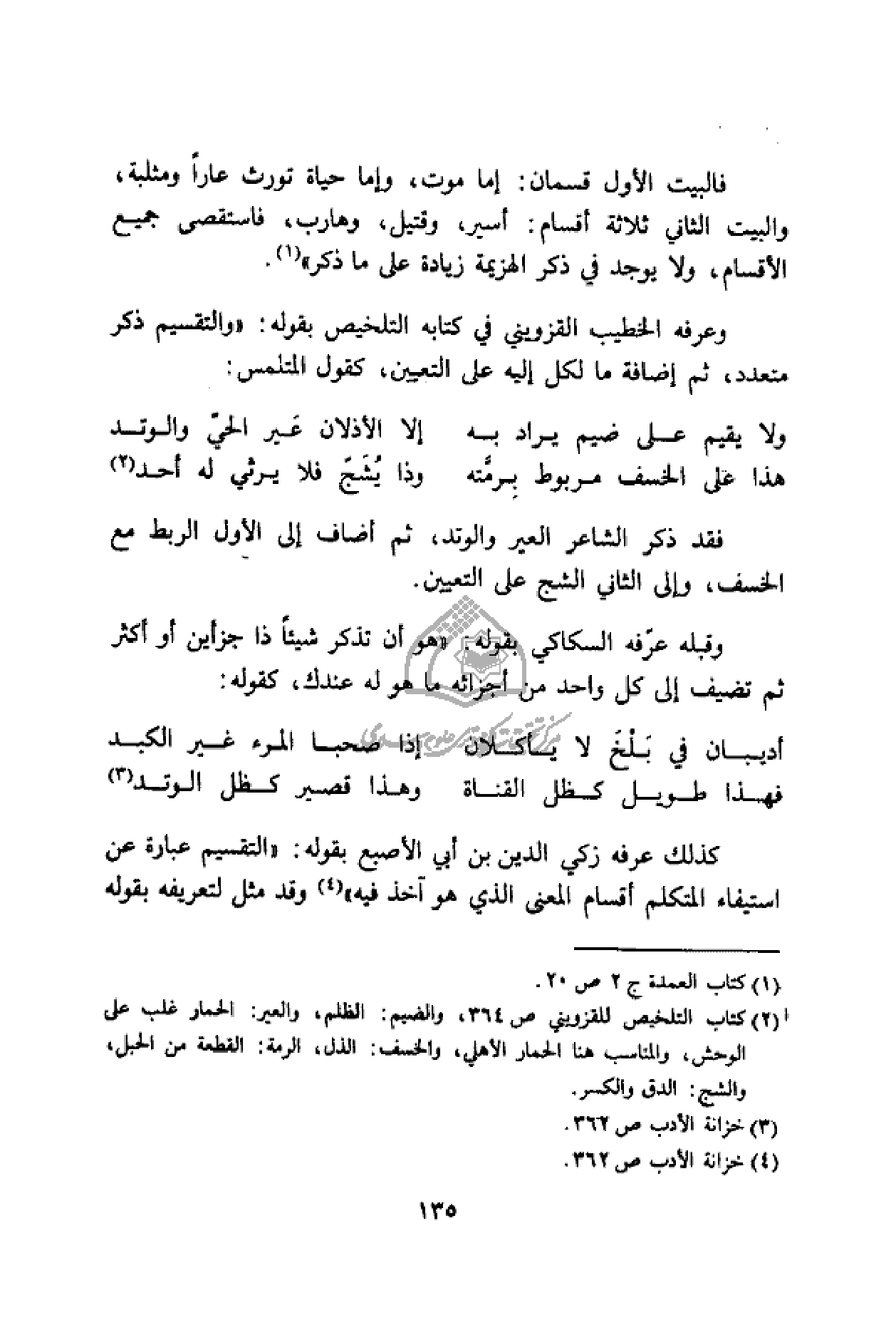 كذلك عرفه زكي الدين بن أبي الأصبع بقوله: «التقسيم عبارة عن استيفاء المتكلم أقسام المعنى الذي هو آخذ فيه» (¬4) وقد مثل لتعريفه بقوله