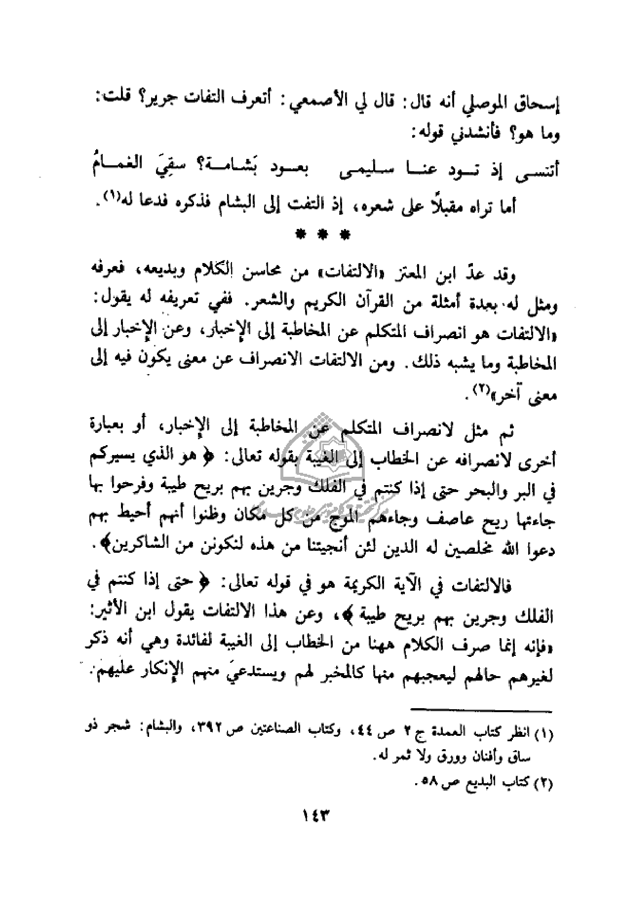 إسحاق الموصلي أنه قال: قال لي الأصمعي: أتعرف التفات جرير؟ قلت: