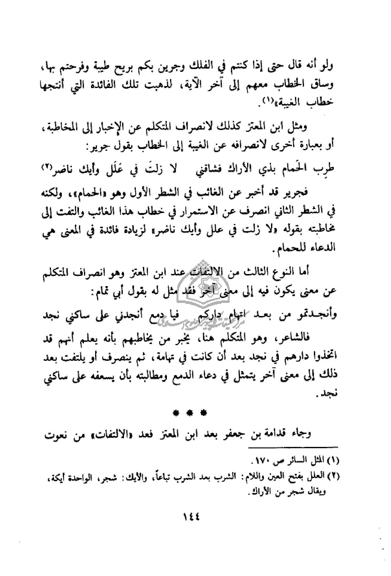 وجاء قدامة بن جعفر بعد ابن المعتز فعد «الالتفات» من نعوت