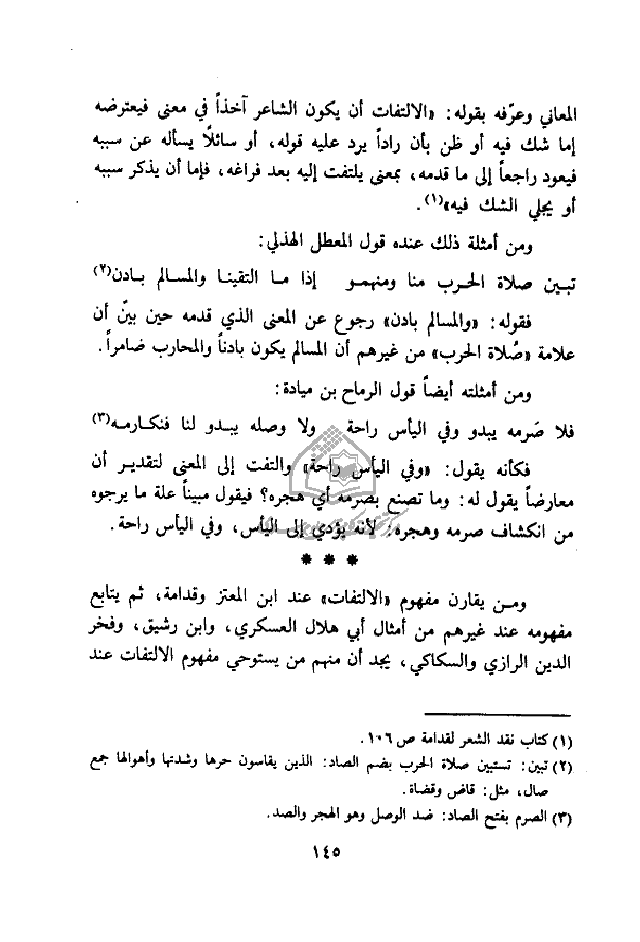 المعاني وعرّفه بقوله: «الالتفات أن يكون الشاعر آخذا في معنى فيعترضه إما شك فيه أو ظن بأن رادا يرد عليه قوله، أو سائلا يسأله عن سببه فيعود راجعا إلى ما قدمه، بمعنى يلتفت إليه بعد فراغه، فإما أن يذكر سببه أو يجلي الشك فيه» (¬1).