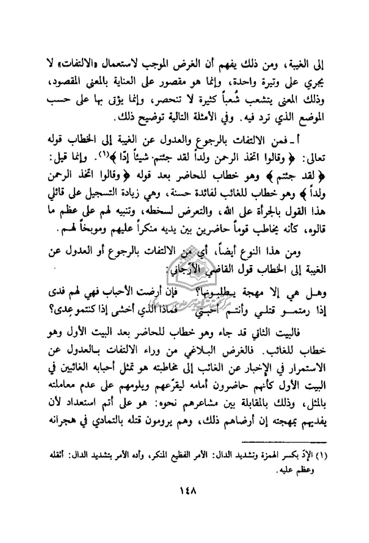 إلى الغيبة، ومن ذلك يفهم أن الغرض الموجب لاستعمال «الالتفات» لا يجري على وتيرة واحدة، وإنما هو مقصور على العناية بالمعنى المقصود، وذلك المعنى يتشعب شعبا كثيرة لا تنحصر، وإنما يؤتى بها على حسب الموضع الذي ترد فيه. وفي الأمثلة التالية توضيح ذلك.