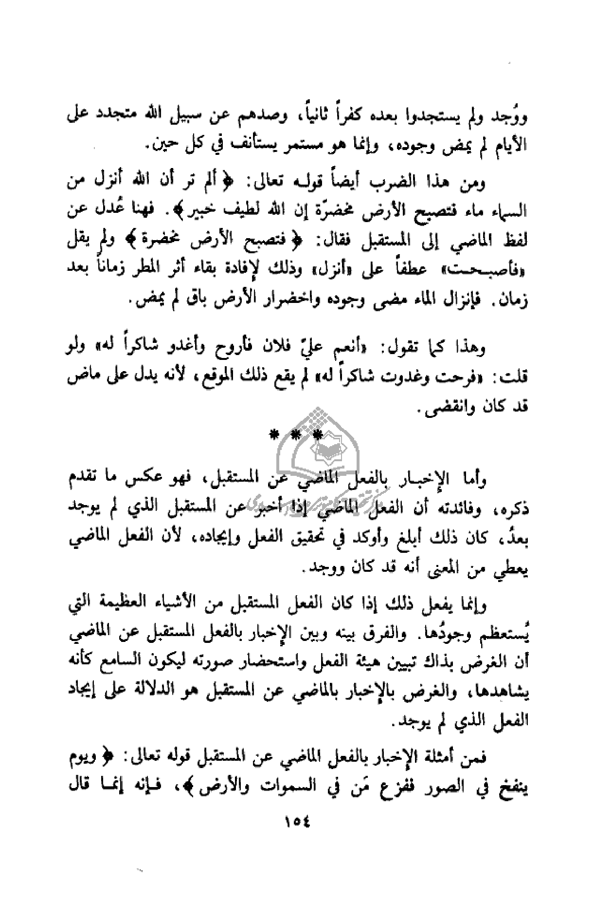 ومن هذا الضرب أيضا قوله تعالى: أَلَمْ تَرَ أَنَّ اللَّهَ أَنْزَلَ مِنَ السَّماءِ ماءً فَتُصْبِحُ الْأَرْضُ مُخْضَرَّةً إِنَّ اللَّهَ لَطِيفٌ خَبِيرٌ. فهنا عدل عن لفظ الماضي إلى المستقبل فقال: فَتُصْبِحُ الْأَرْضُ مُخْضَرَّةً ولم يقل «فأصبحت» عطفا على «أنزل» وذلك لإفادة بقاء أثر المطر زمانا بعد زمان. فإنزال الماء مضى وجوده واخضرار الأرض باق لم يمض.
