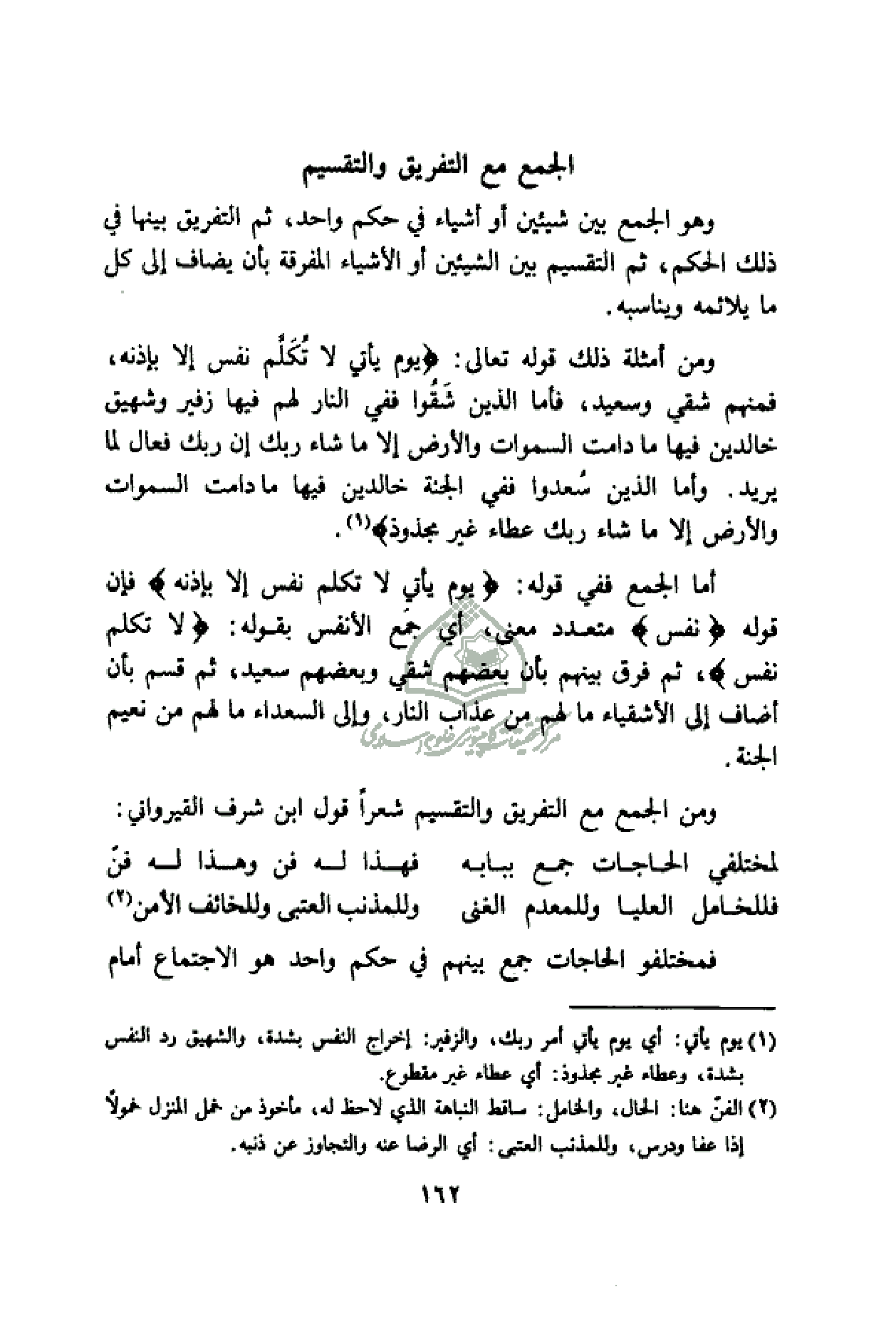 أما الجمع ففي قوله: يَوْمَ يَأْتِ لا تَكَلَّمُ نَفْسٌ إِلَّا بِإِذْنِهِ فإن قوله نَفْسٌ متعدد معنى، أي جمع الأنفس بقوله: لا تَكَلَّمُ نَفْسٌ، ثم فرق بينهم بأن بعضهم شقي وبعضهم سعيد، ثم قسم بأن أضاف إلى الأشقياء ما لهم من عذاب النار، وإلى السعداء ما لهم من نعيم الجنة.