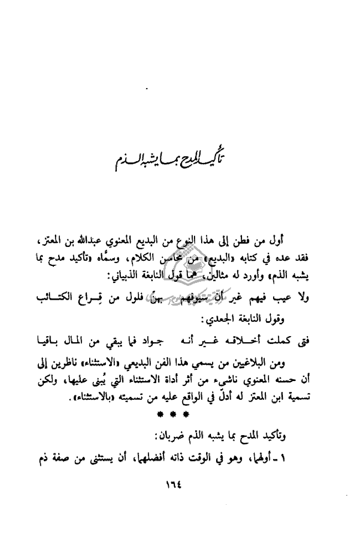 أول من فطن إلى هذا النوع من البديع المعنوي عبد الله بن المعتز، فقد عده في كتابه «البديع» من محاسن الكلام، وسمّاه «تأكيد مدح بما يشبه الذم» وأورد له مثالين، هما قول النابغة الذبياني: