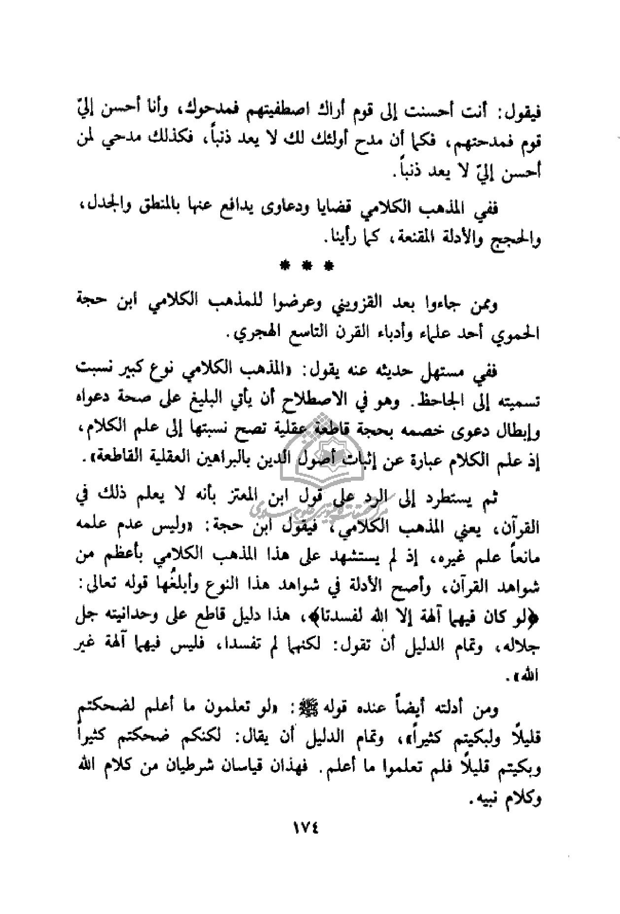 وممن جاءوا بعد القزويني وعرضوا للمذهب الكلامي ابن حجة الحموي أحد علماء وأدباء القرن التاسع الهجري.