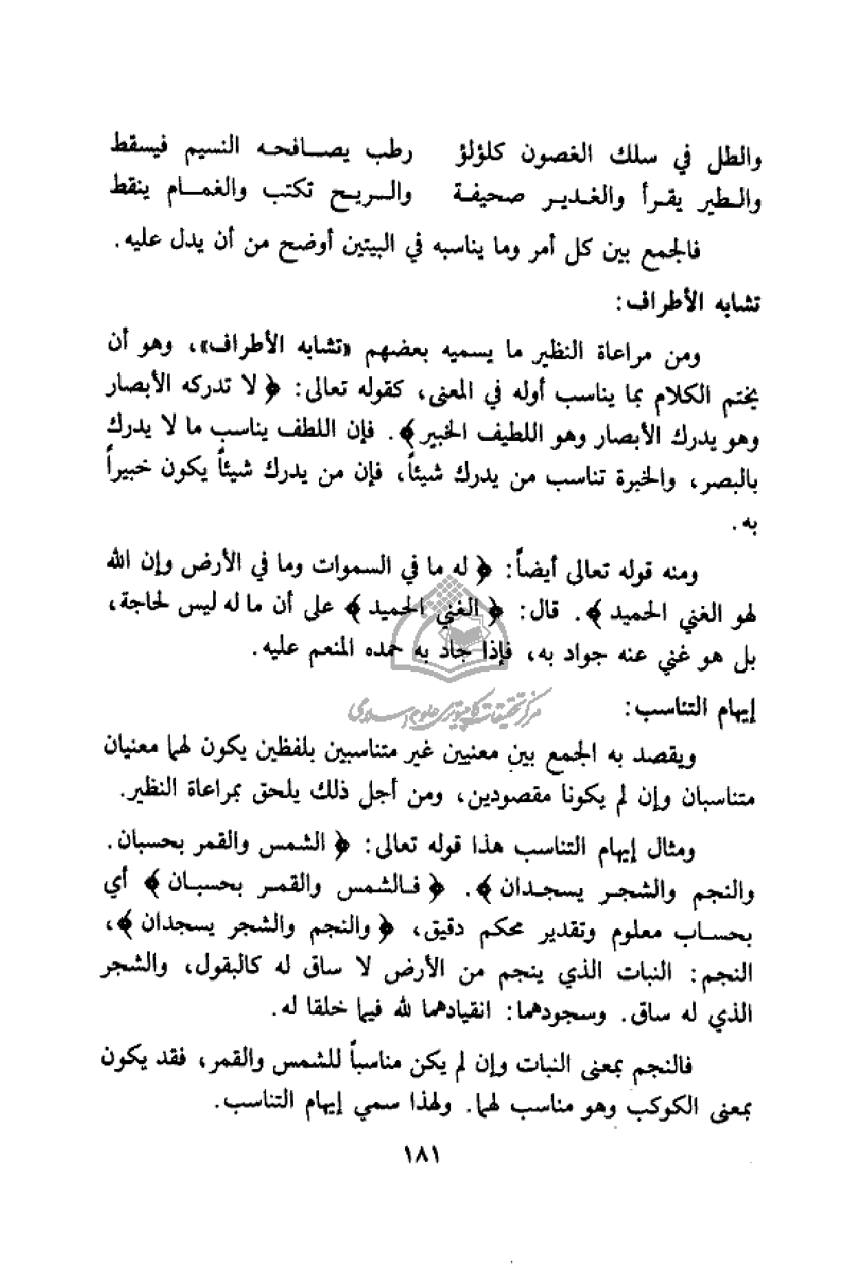 ومن مراعاة النظير ما يسميه بعضهم «تشابه الأطراف»، وهو أن يختم الكلام بما يناسب أوله في المعنى، كقوله تعالى: لا تُدْرِكُهُ الْأَبْصارُ وَهُوَ يُدْرِكُ الْأَبْصارَ وَهُوَ اللَّطِيفُ الْخَبِيرُ. فإن اللطف يناسب ما لا يدرك بالبصر، والخبرة تناسب من يدرك شيئا، فإن من يدرك شيئا يكون خبيرا به.