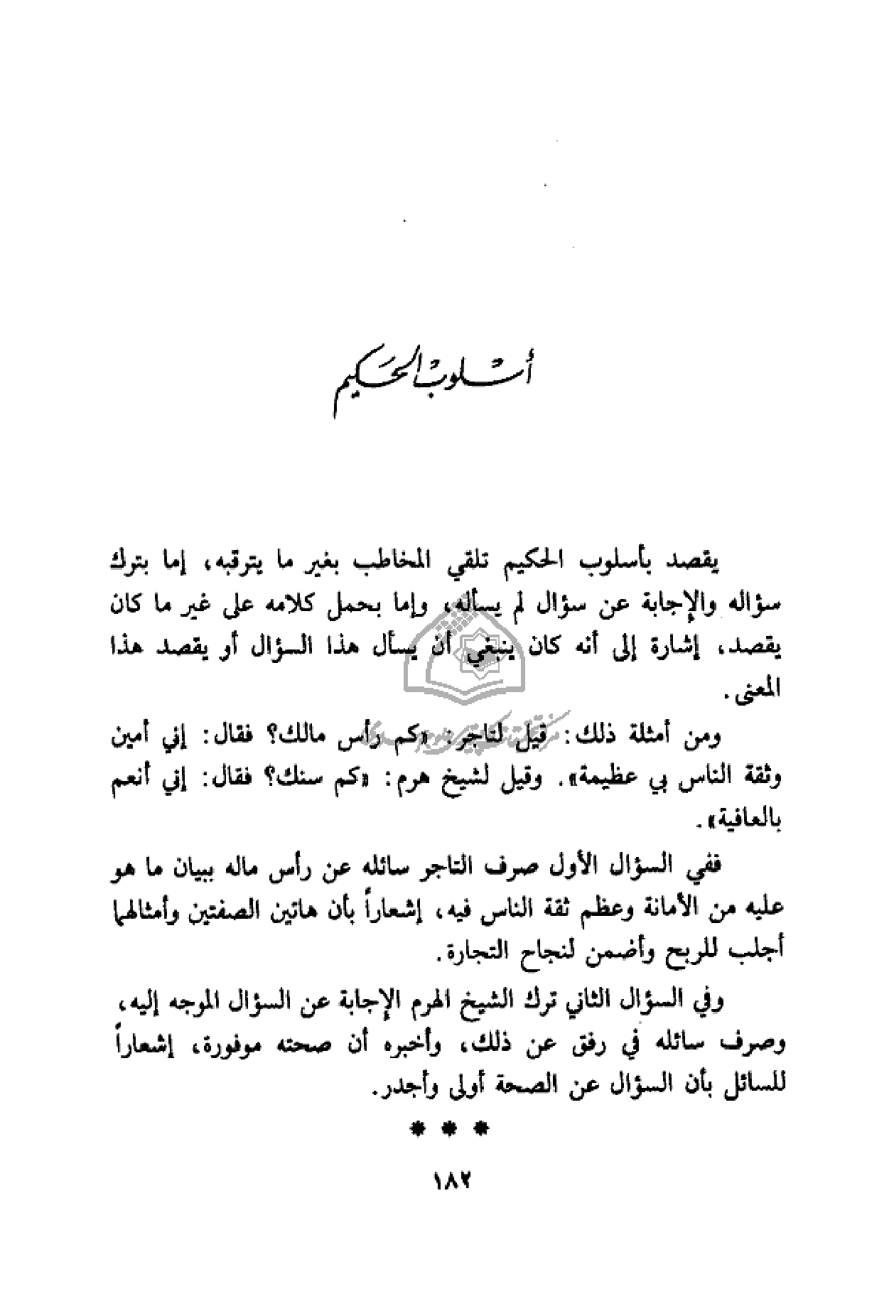 وفي السؤال الثاني ترك الشيخ الهرم الإجابة عن السؤال الموجه إليه، وصرف سائله في رفق عن ذلك، وأخبره أن صحته موفورة، إشعارا للسائل بأن السؤال عن الصحة أولى وأجدر.